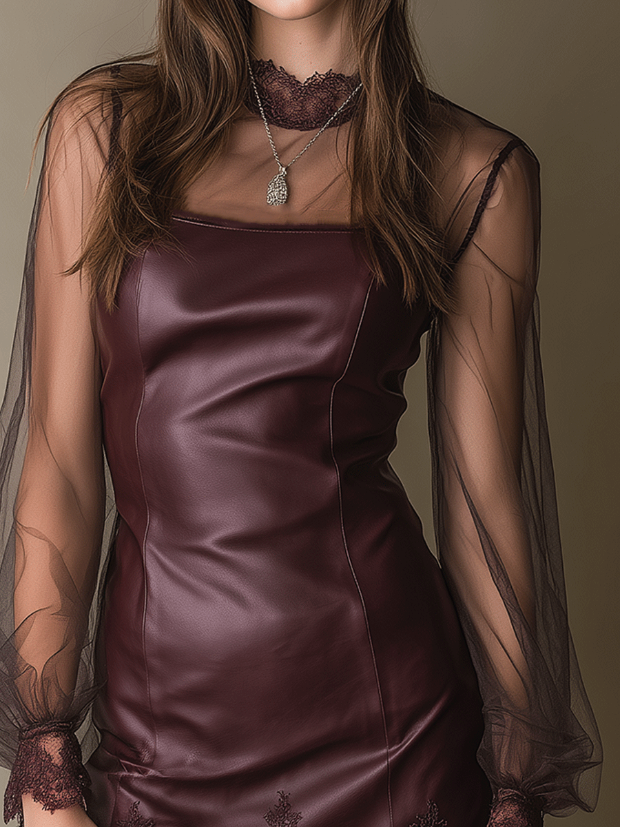Burgundy Sheer-Sleeve Faux Leather Lace Mini Dress