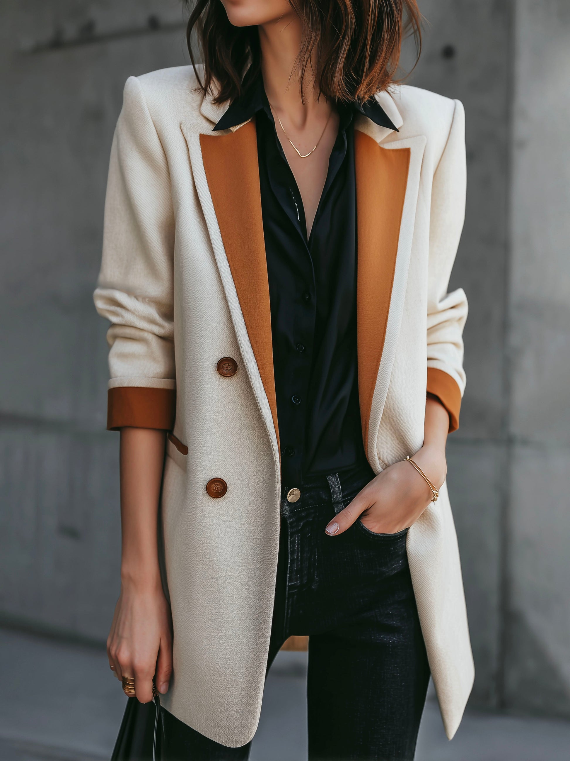 - Design: Double-breasted style with a contrast trim for a chic and modern look.