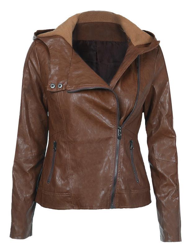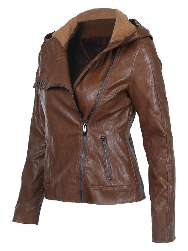 This jacket is made from high-quality leather. The zipper closure allows for easy on and off. The pocket design is both practical and stylish. The hood provides more styling options.