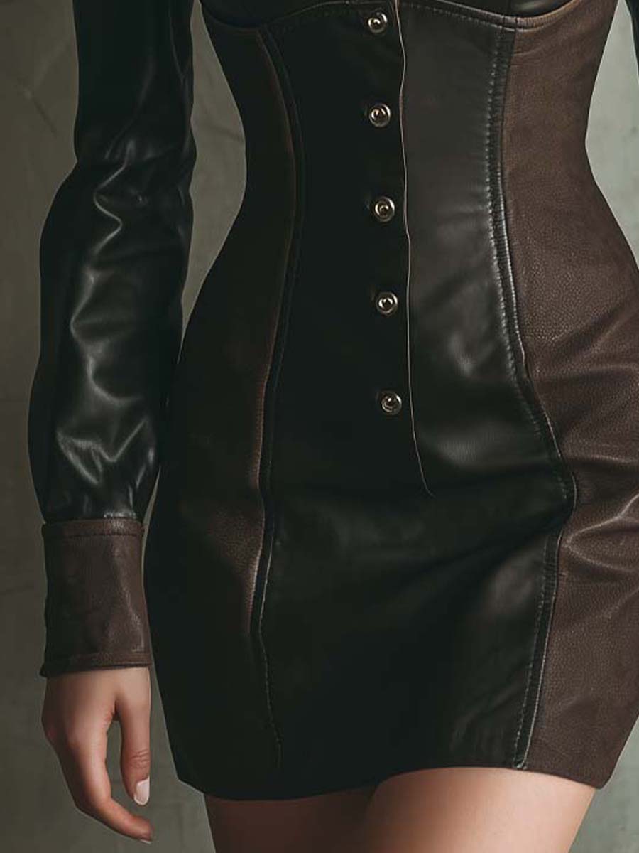 Contrast Panel Eco-Leather Bodycon Dress – Espresso Brown