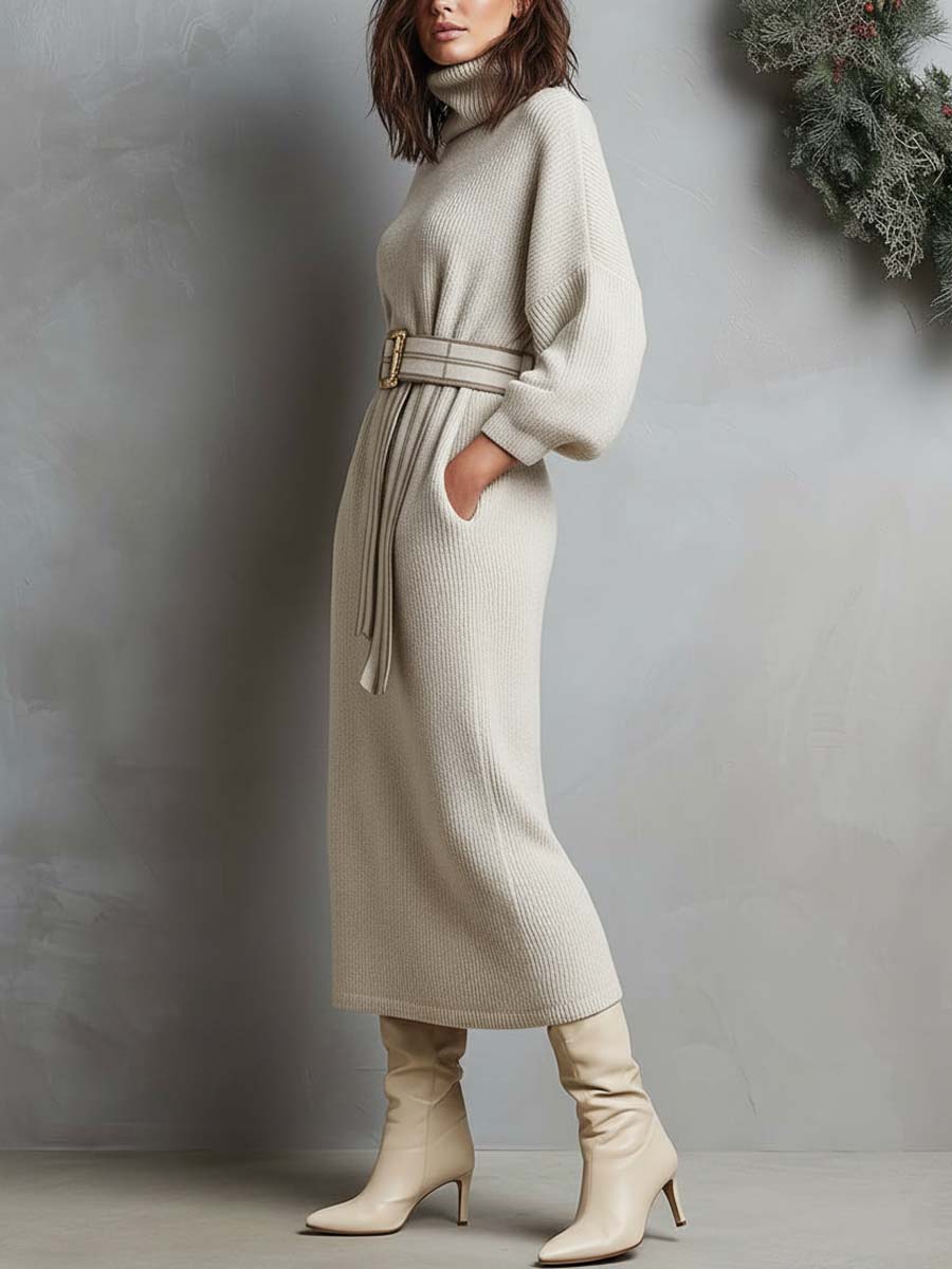 Cozy Knit Turtleneck Midi Dress With Matching Knit Belt