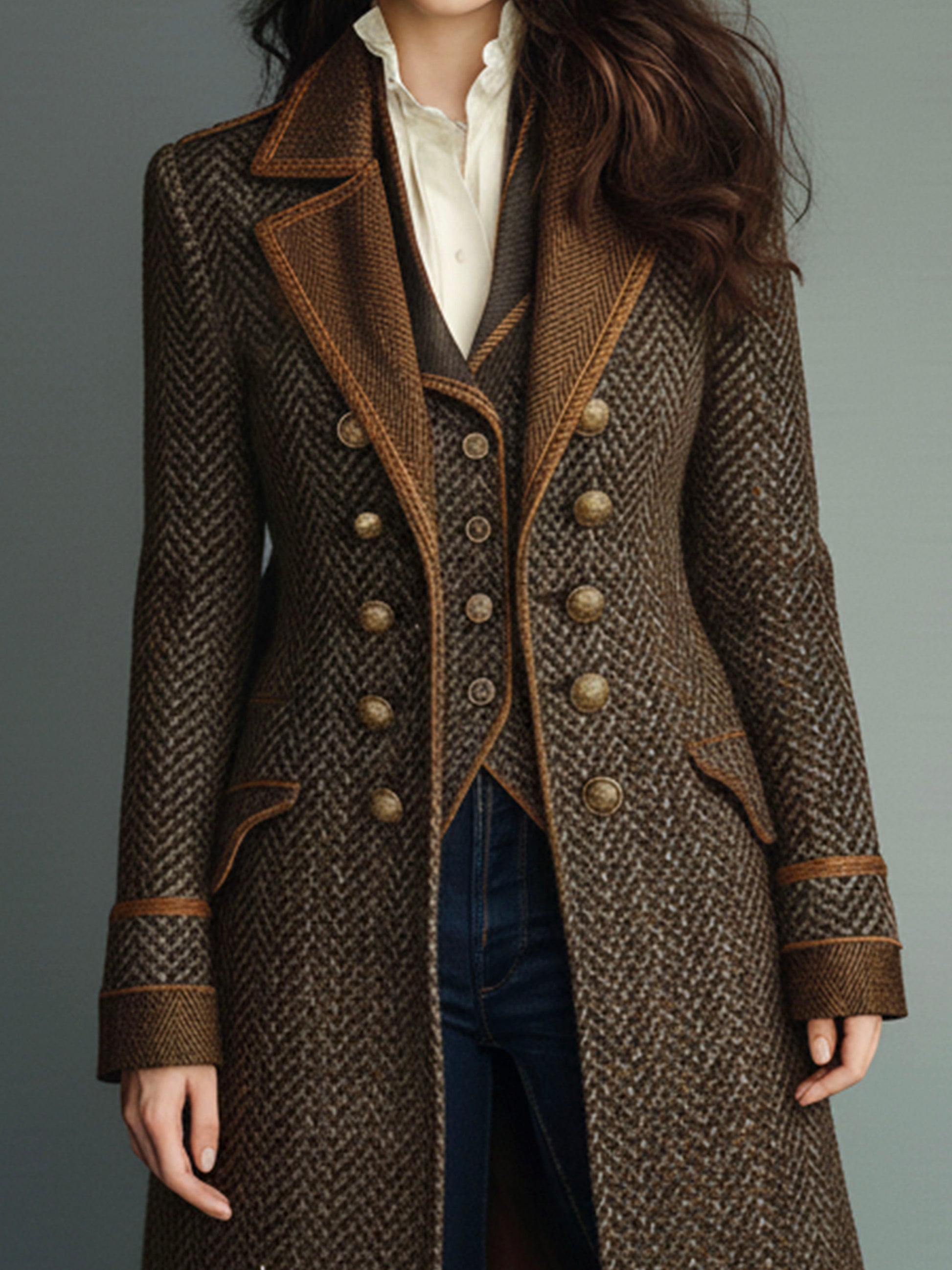 This Double-Breasted Herringbone Wool Long Coat is a statement piece that combines timeless elegance with modern charm. Crafted from high-quality wool, its herringbone pattern adds texture and depth, while the contrast lapel provides a striking visual point of interest.