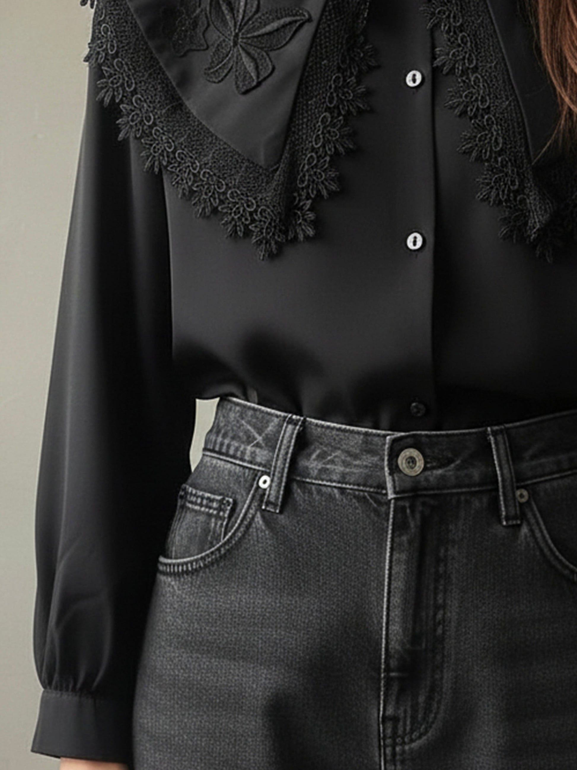 Elegant Black Embroidered Lace Collar Shirt
