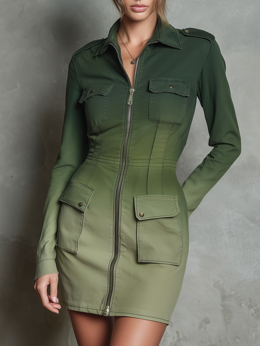 Elegant Denim Gradient Washed Flap Pocket Slim Mini Dress