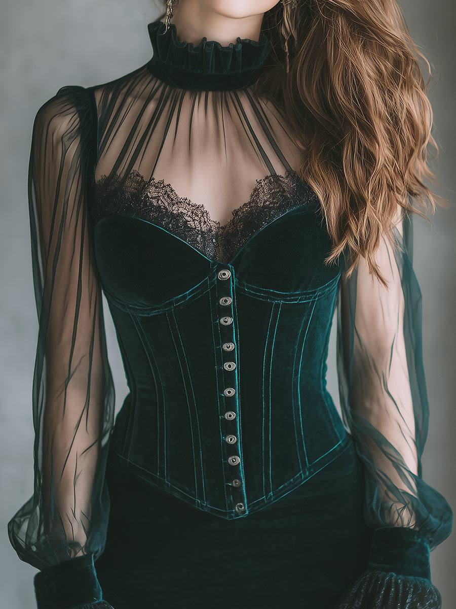 Elegant Polyester Velvet Mesh Spliced stand Collar Slim Mini Dress