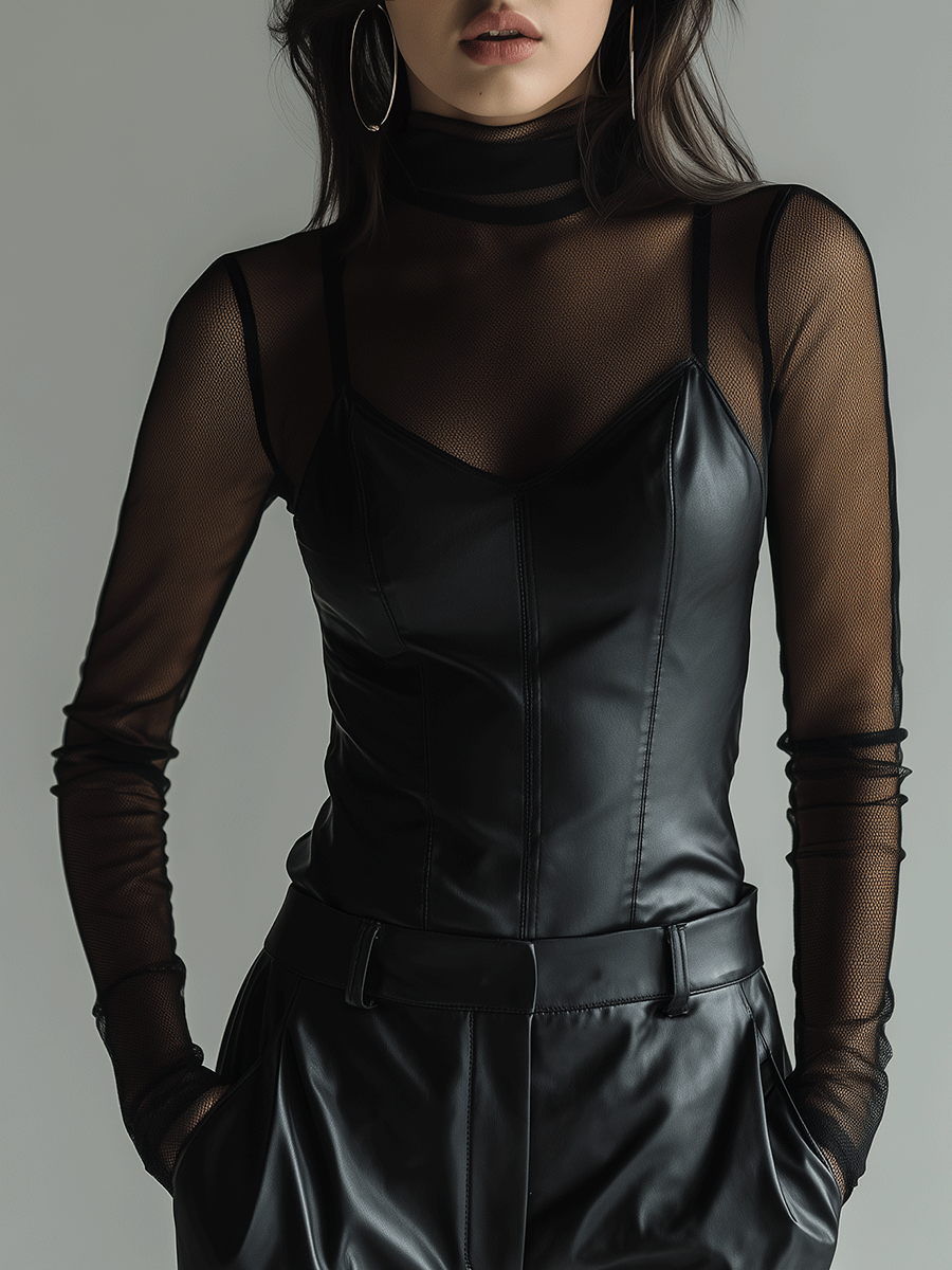 The Fashion Black Sheer Mesh Layered Faux Leather Top is not just a piece of clothing but a fashion statement. Its unique blend of materials and stylish design make it a versatile addition to any closet. Whether you’re dressing up for an evening out or aiming for a polished day look, this top provides endless styling possibilities and unmatched flair.