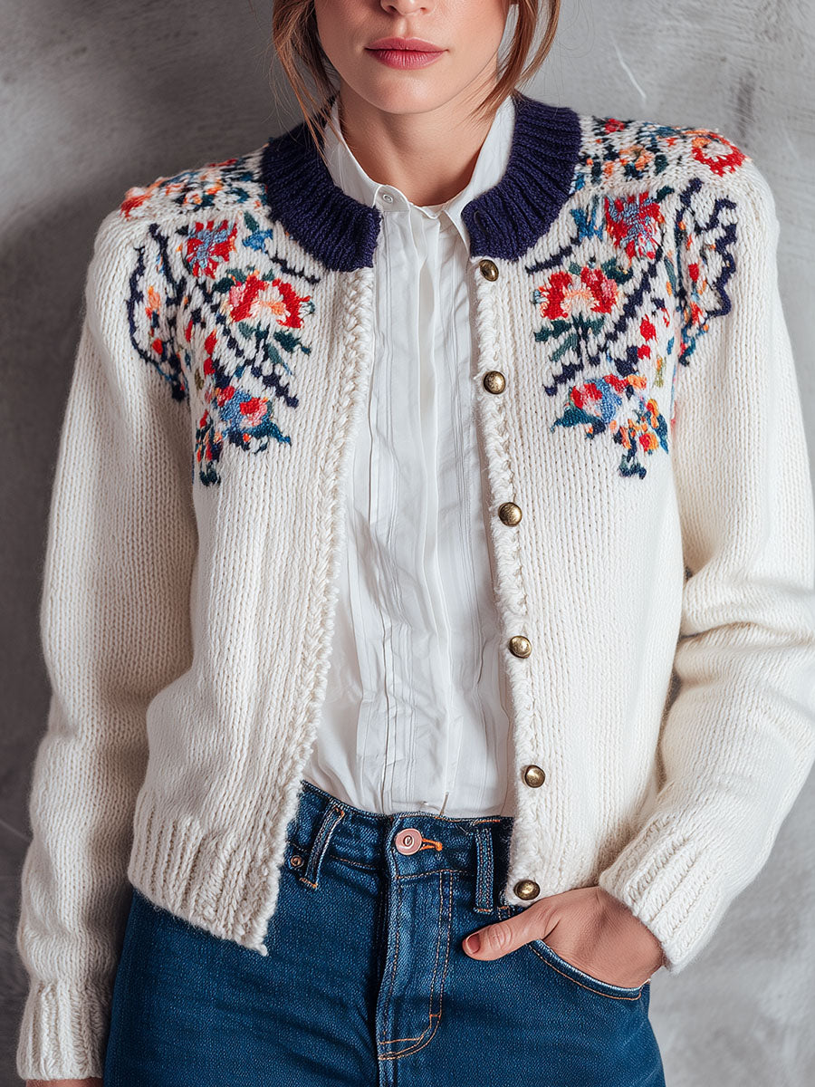 This Floral Yoke Embroidery White Knit Cardigan with Navy Collar is an essential addition to any wardrobe. Its refined details and cozy material make it perfect for both daytime wear and evening gatherings, providing both versatility and style.