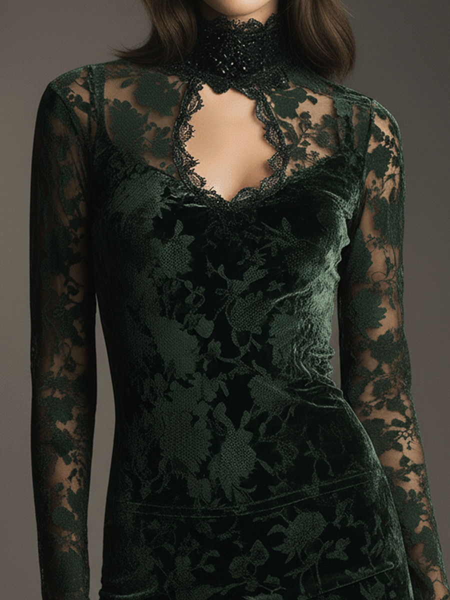 Gothic Bohemian Emerald Velvet Lace Mini Dress