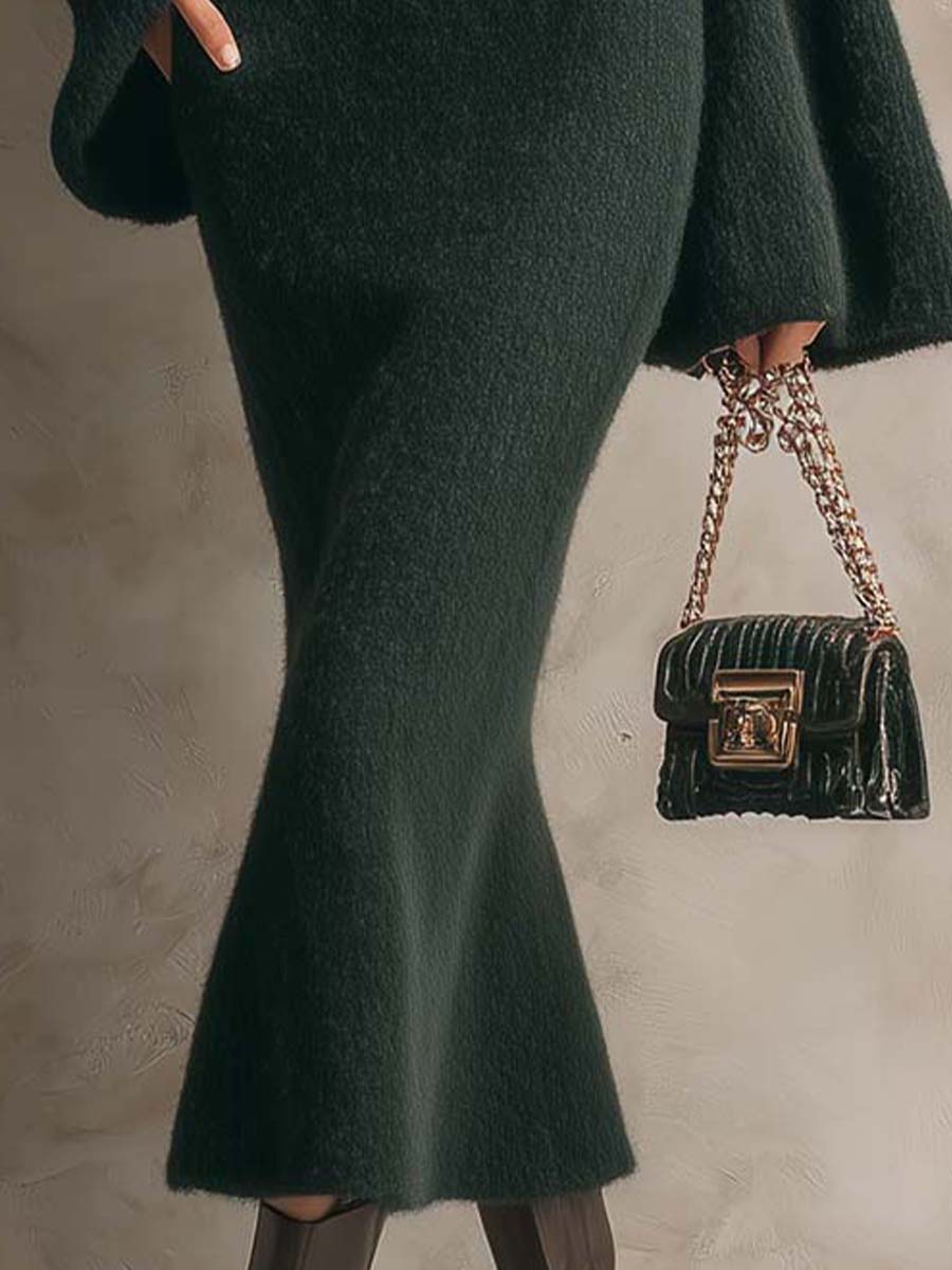 This high-neck knit maxi dress in deep forest green combines minimal elegance with soft, sculptural volume. The flared sleeves and subtle fishtail hem create graceful movement, while the plush textured knit flatters the body with gentle structure.