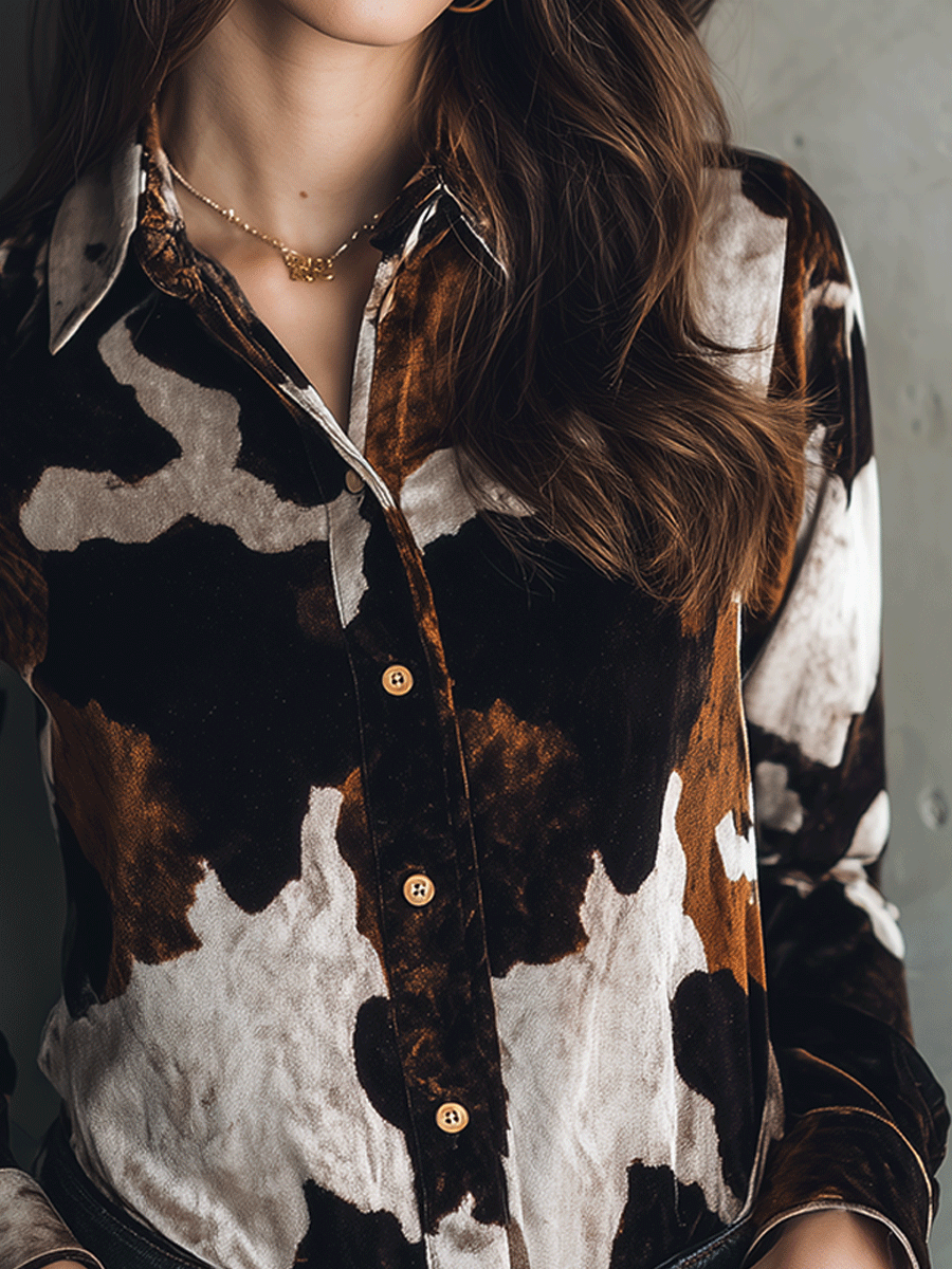 Luxe Texture Velvet Cow Print Button-Up Shirt