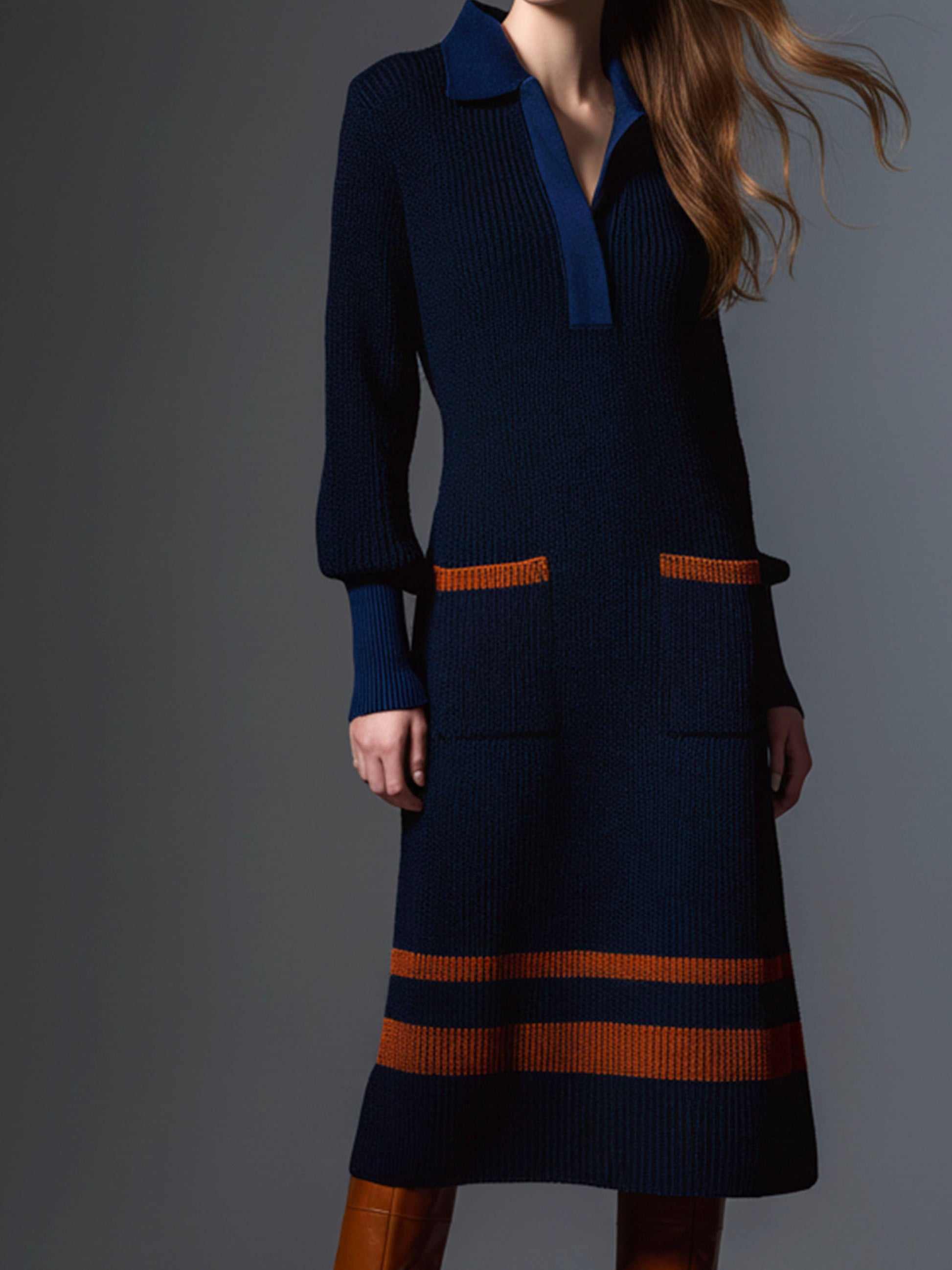 Navy Knit Contrast Orange Stripes Polo Midi Dress With Pockets