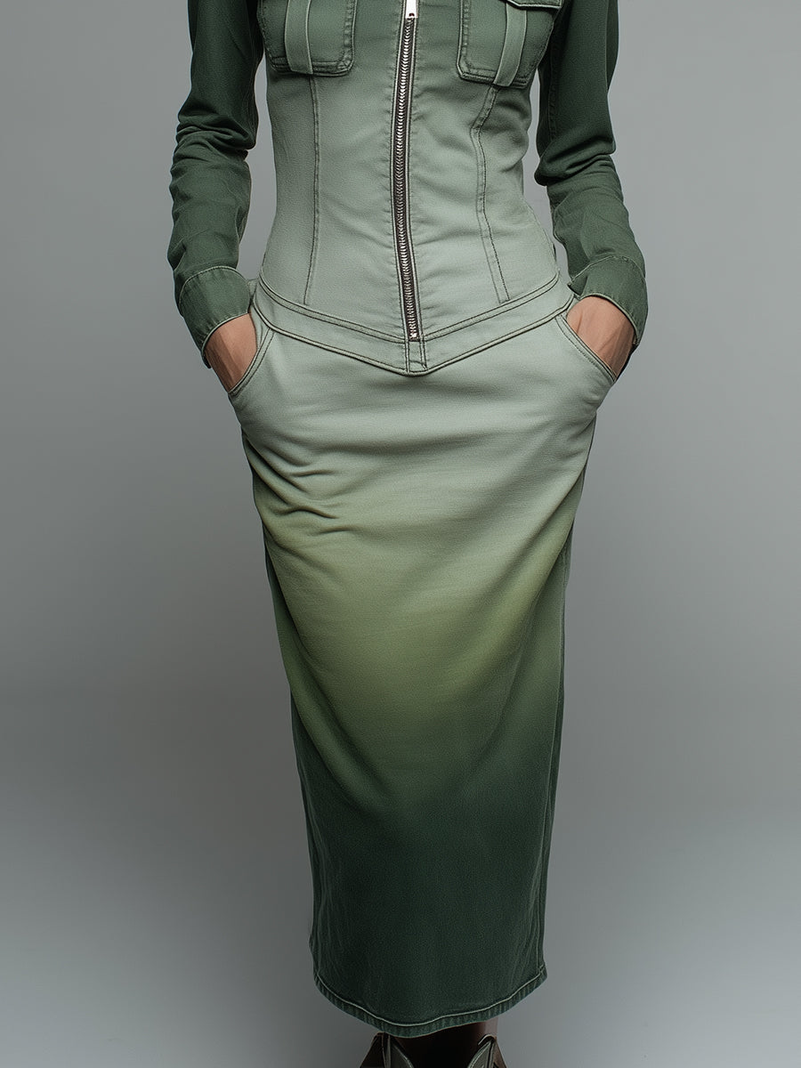 This Retro Denim Gradient Washed Front Zipper Midi Dress is a stylish blend of vintage aesthetics and modern design. It features a gradient wash that gives the denim a unique, faded appearance, perfect for creating a nostalgic yet fashionable look.