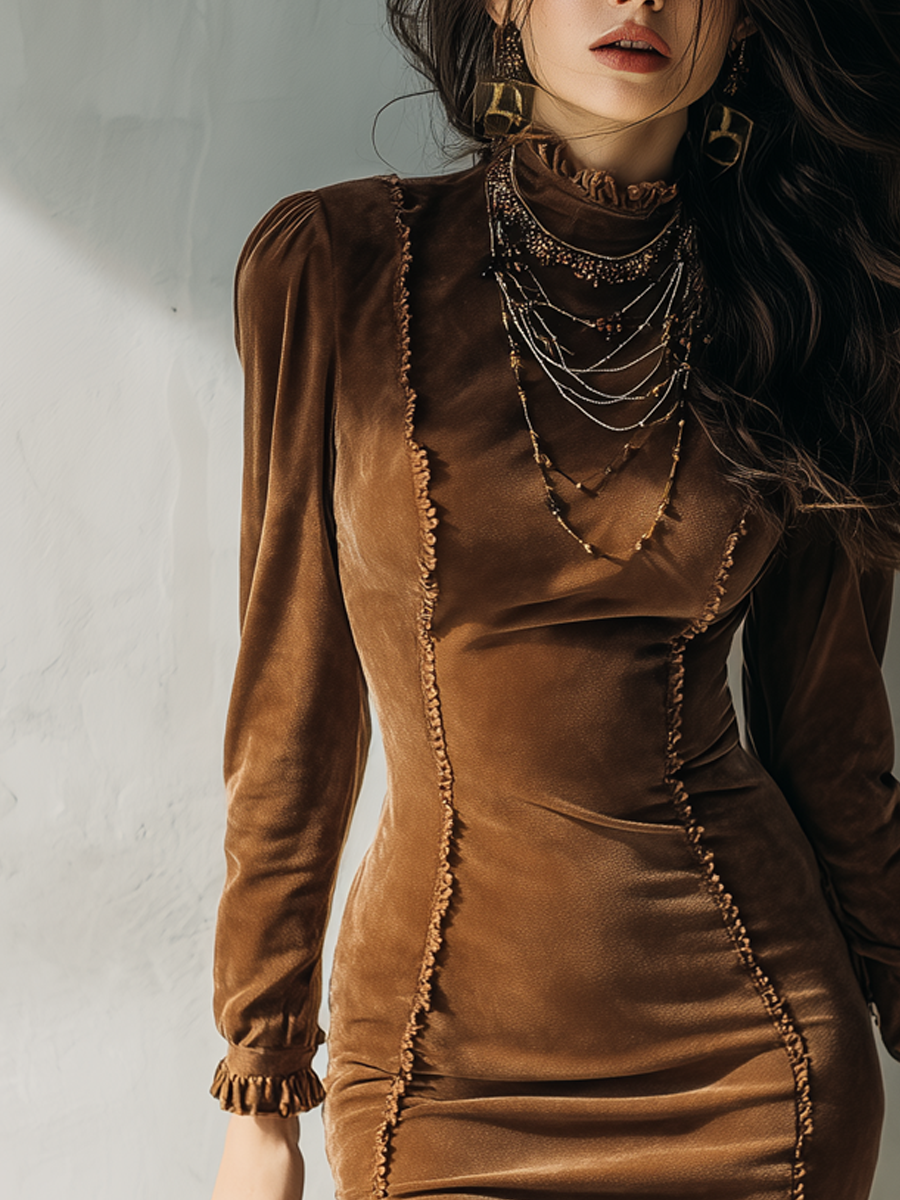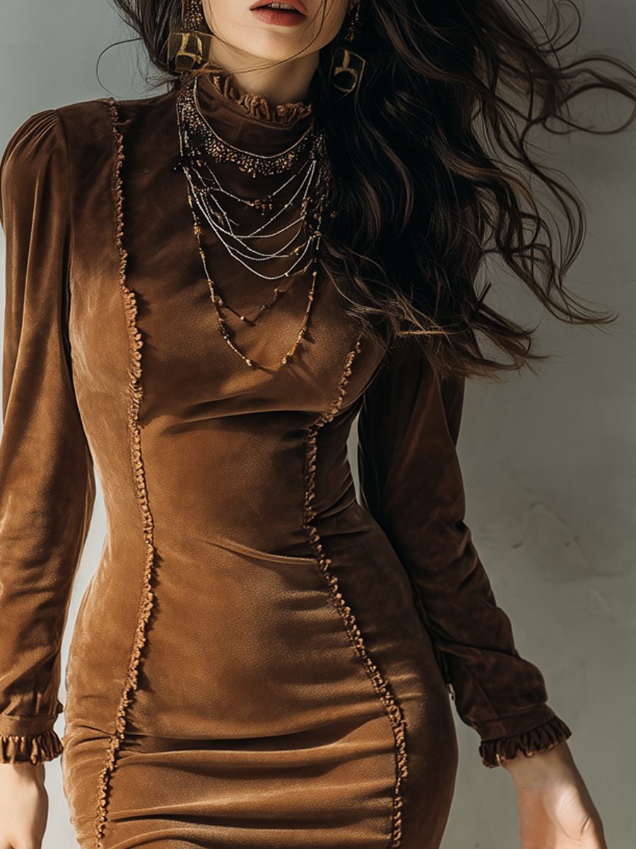 The Retro Ruffled Slim-fit Polyester Velvet Mini Dress is a must-have for any fashion-forward wardrobe. Its blend of classic and modern elements ensures that you stand out with grace and confidence. Embrace your individuality and make a memorable impression with this elegant dress.