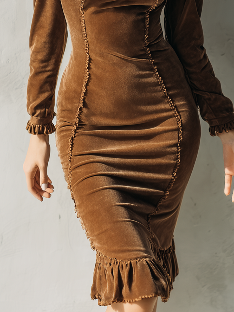 Retro Ruffled Slim-fit Polyester Velvet Mini Dress