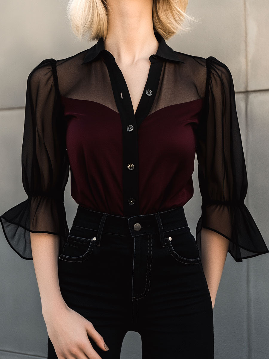 Retro Sheer Sleeves Burgundy Chiffon Contrast Blouse