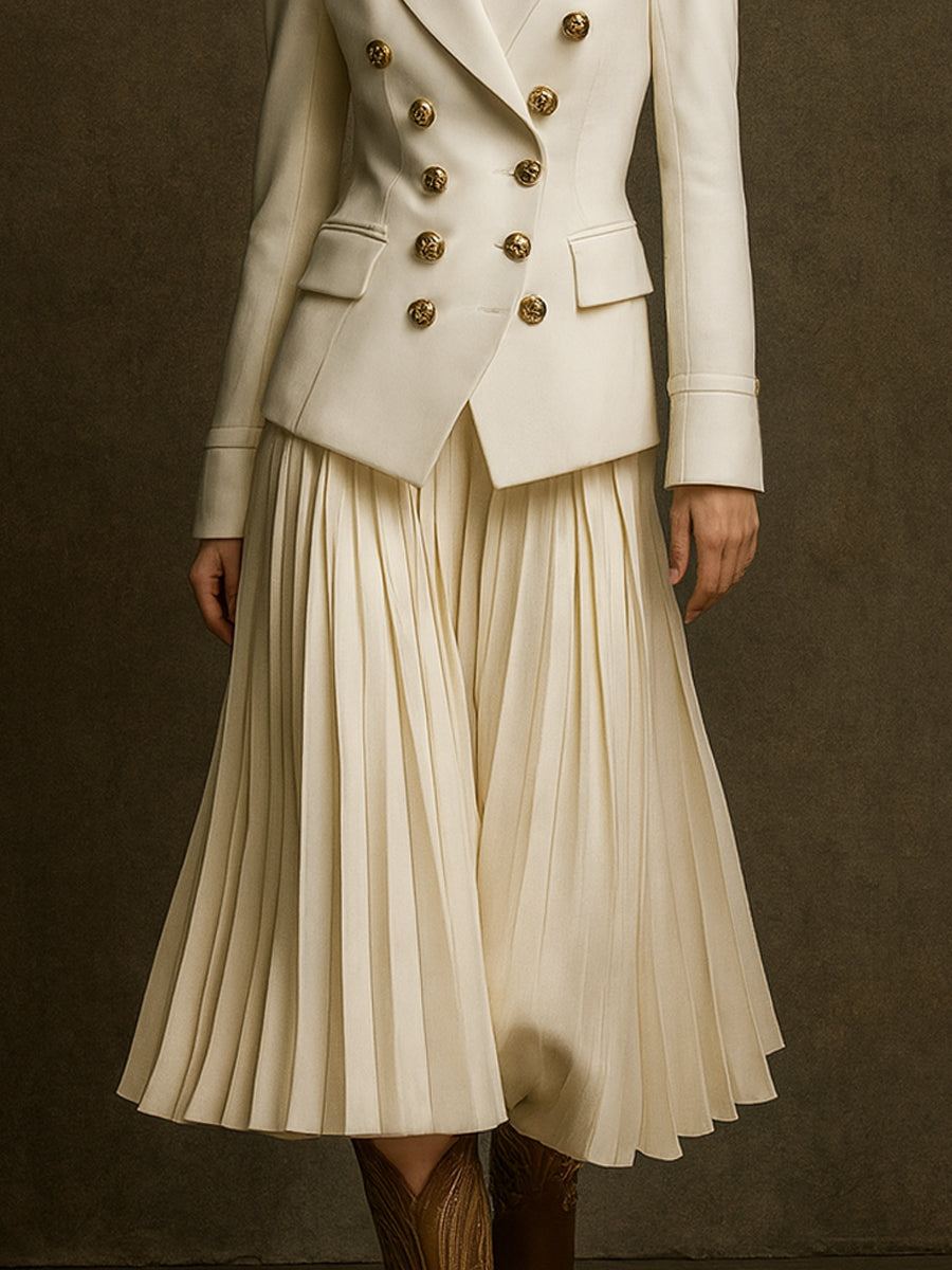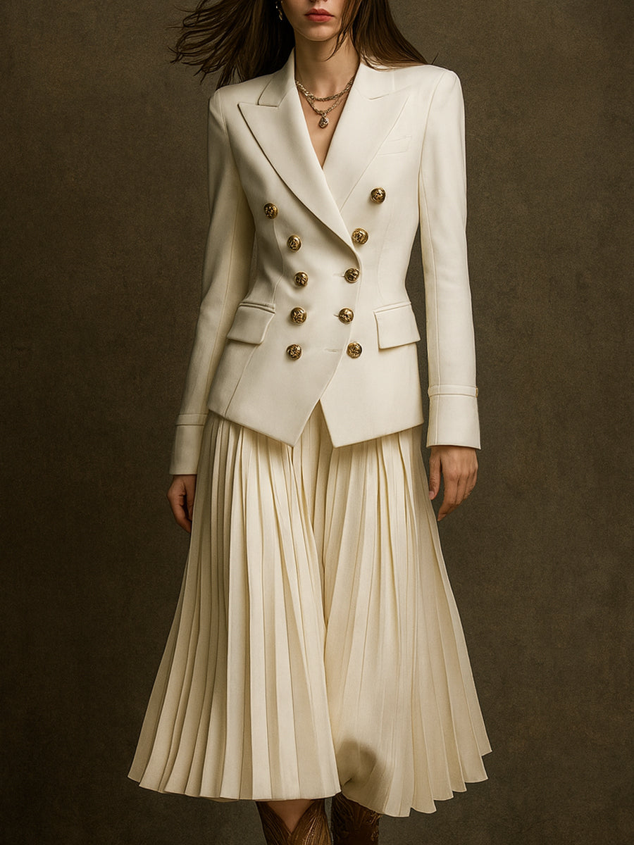 To create a polished look, pair the Retro Slim Lapel Double Row Metal Button Blazer with tailored dress pants or a pencil skirt. For a more relaxed yet chic appearance, style it with high-waisted jeans and a simple top. Accessorize with a statement necklace or an elegant scarf to complement the blazer's timeless design.