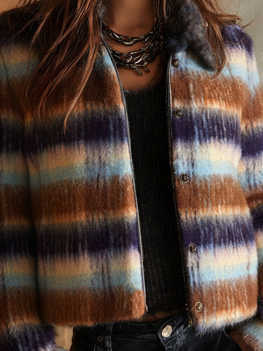 This retro jacket pairs perfectly with both casual and formal outfits. For a sophisticated look, combine it with a turtleneck sweater and tailored trousers. To create a more relaxed appearance, wear it over a simple t-shirt and jeans. Enhance your style by adding accessories like a woolen scarf or leather gloves.