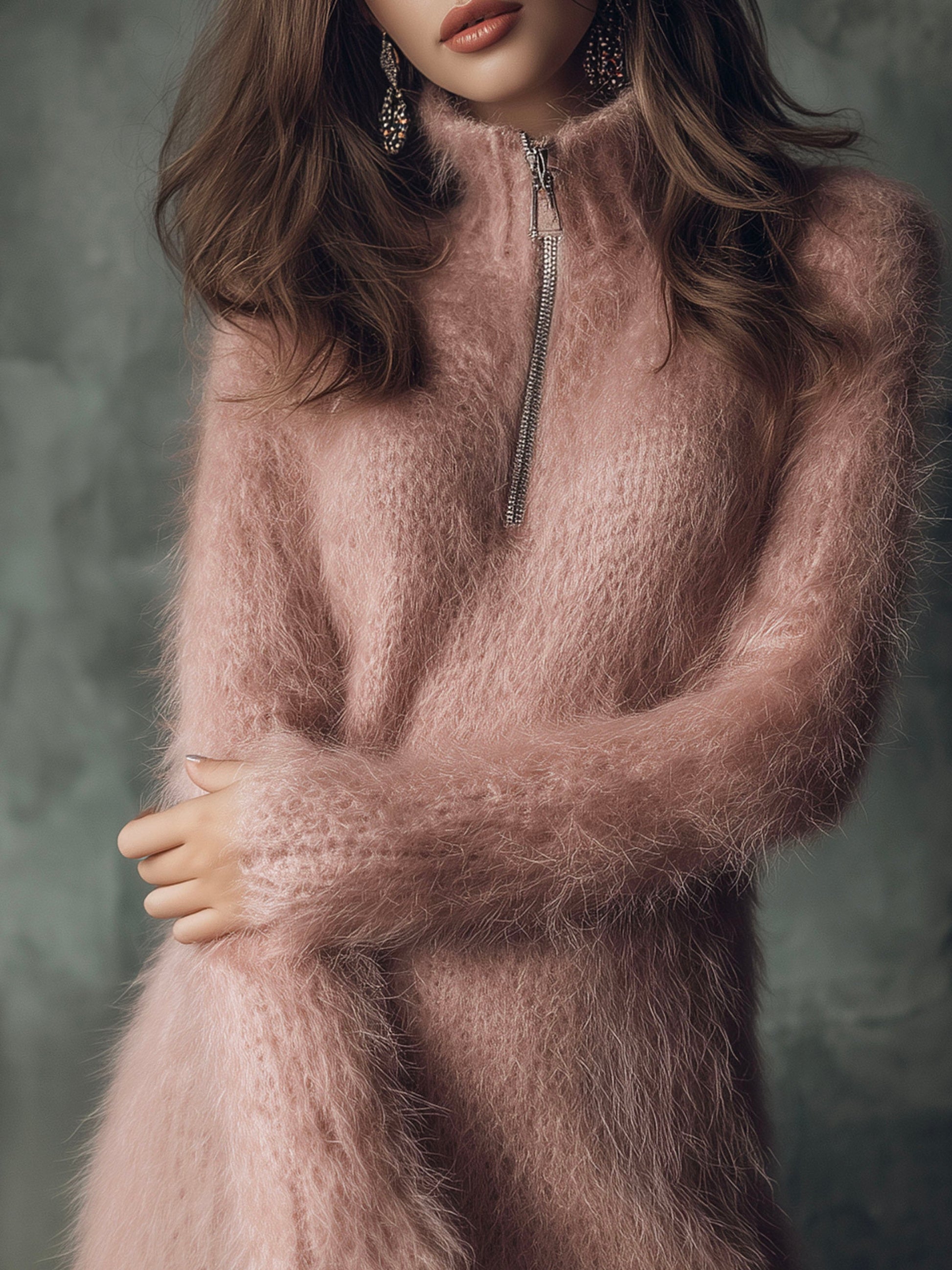 Soft Fluffy Knit Sweater Mini Dress With Half Zip Collar