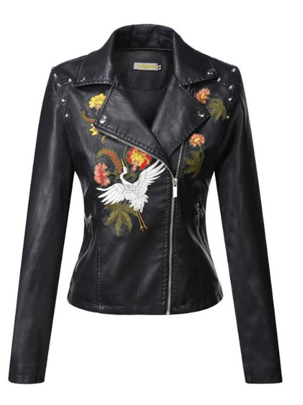 This jacket is made from PU leather. The front of the jacket features a zipper closure. The jacket is adorned with rivets and floral embroidery. Designed with a cropped cut typical of jackets, it may be shorter in length.
