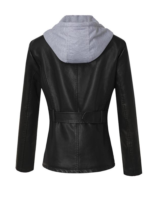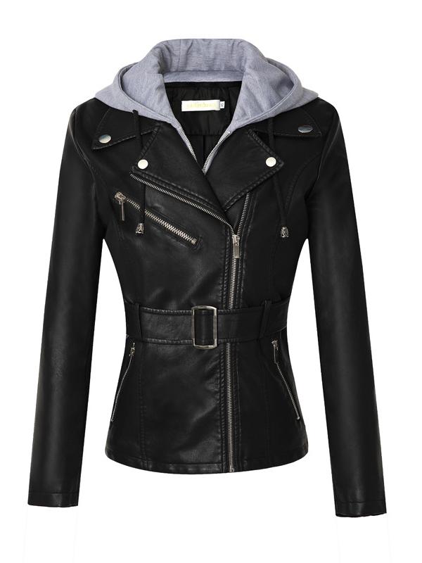 Stylish Hooded Zipper-up Waist Belt Leather Jacket