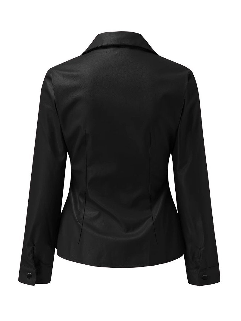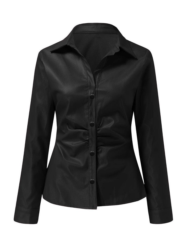 Stylish Lapel Waist-cinched Button Down Leather Shirt