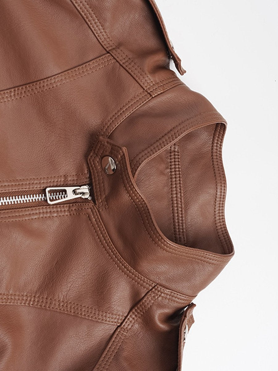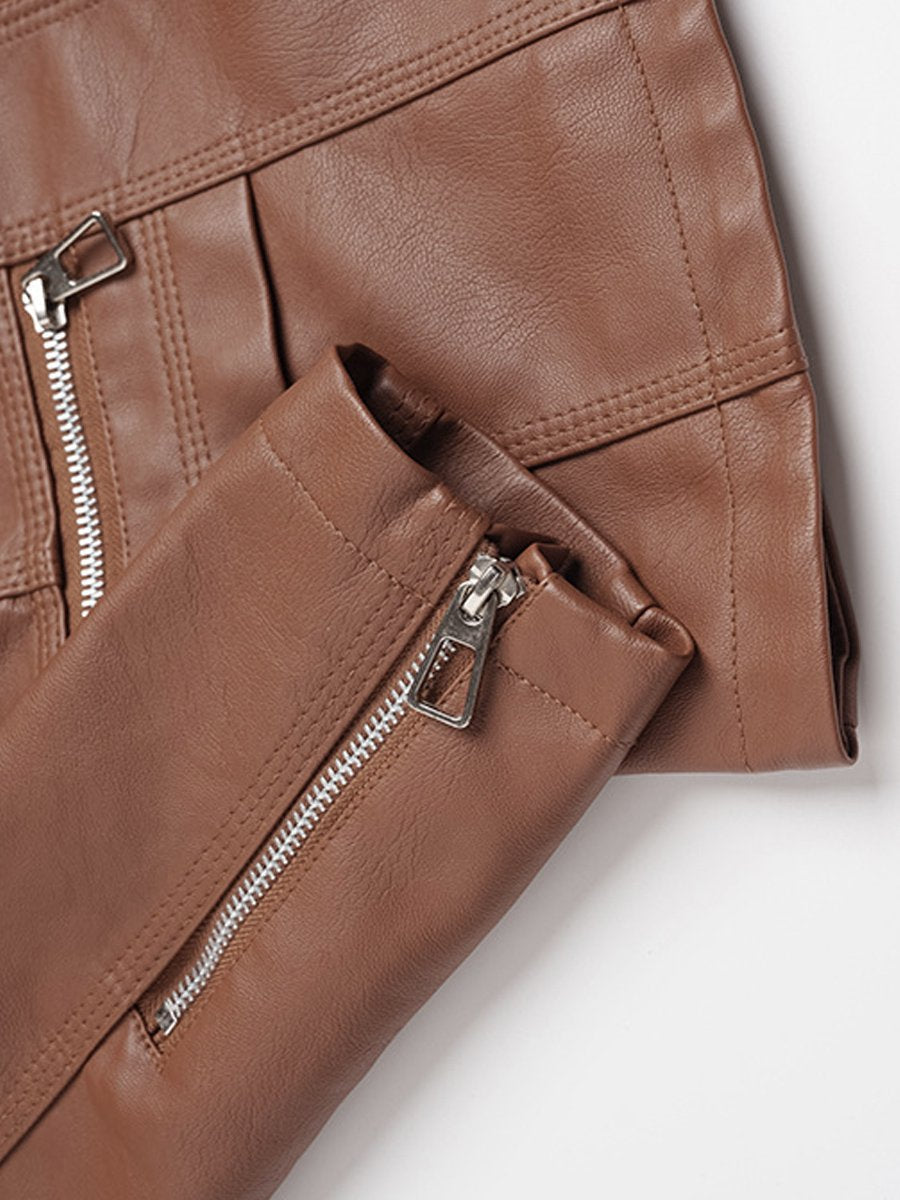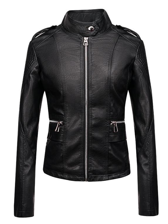 This jacket is made from high-quality leather. The zipper closure allows for easy on and off. The stand collar design is both sleek and classic. The solid color design is simple and elegant, making it easy to pair with other outfits.