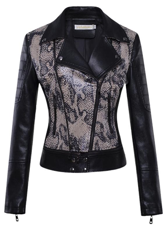 This jacket is made from high-quality leather. The zipper closure allows for easy on and off. The pocket design is both practical and stylish. The snake print and color patchwork design is full of fashion and creativity.