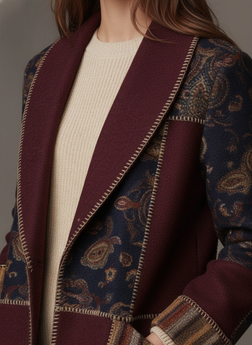 The Bohemian Patchwork Duster Coat is an exquisite fusion of artisanal craftsmanship and free-spirited elegance. This distinctive long coat features a rich burgundy base complemented by intricately patterned panels of paisley and striped textiles. Each patch is thoughtfully stitched, creating a unique visual tapestry that evokes a sense of global artistry and vintage charm.