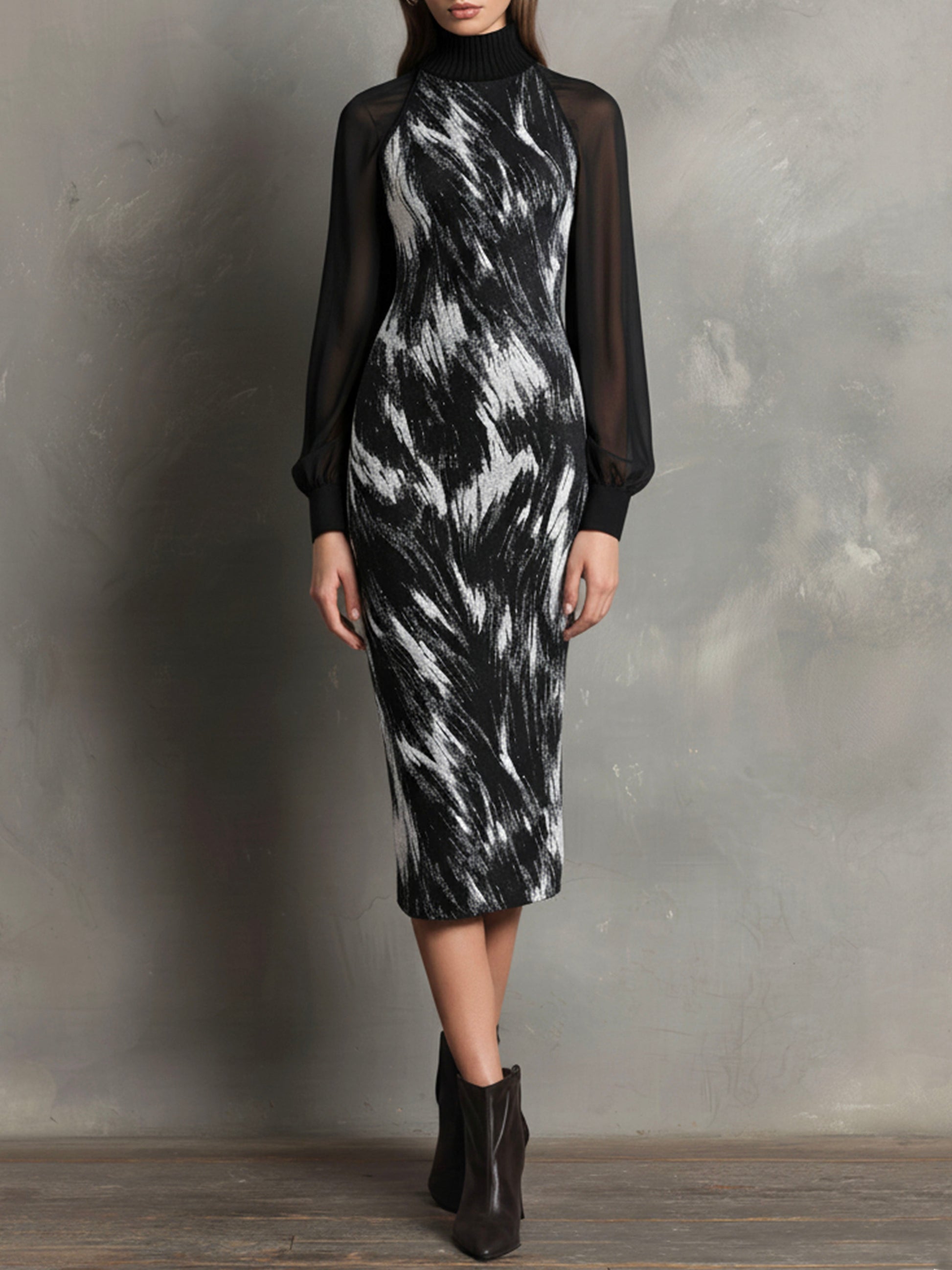 Embrace style and sophistication with this Turtleneck Black And White Abstract Jacquard Midi Dress With Sheer Sleeve. Its unique design and high-quality fabric make it a versatile addition to any wardrobe, suitable for both day and evening wear, ensuring you stand out at any event with grace and poise.
