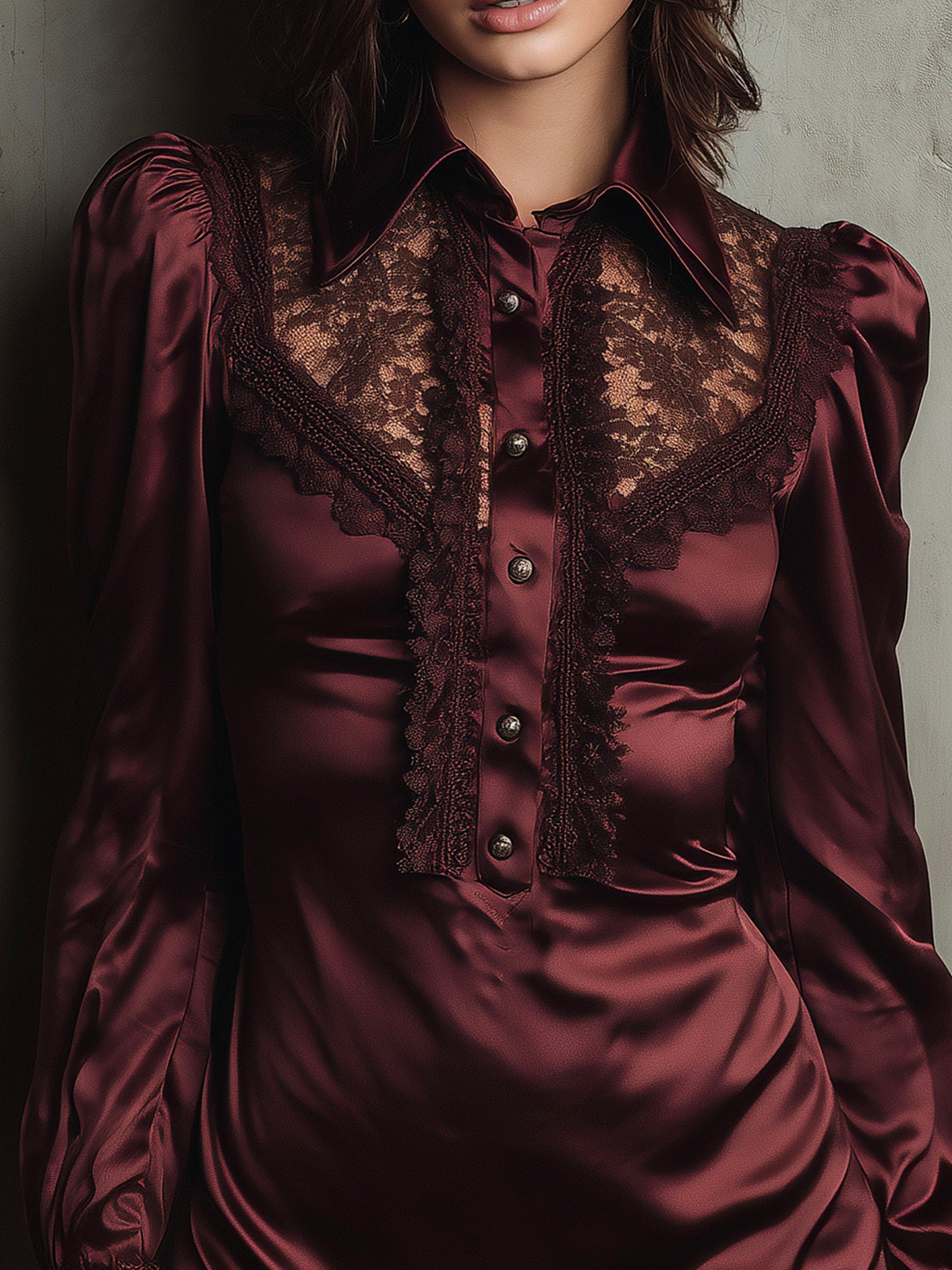 Vintage Burgundy Satin Mini Dress With Lace Accents