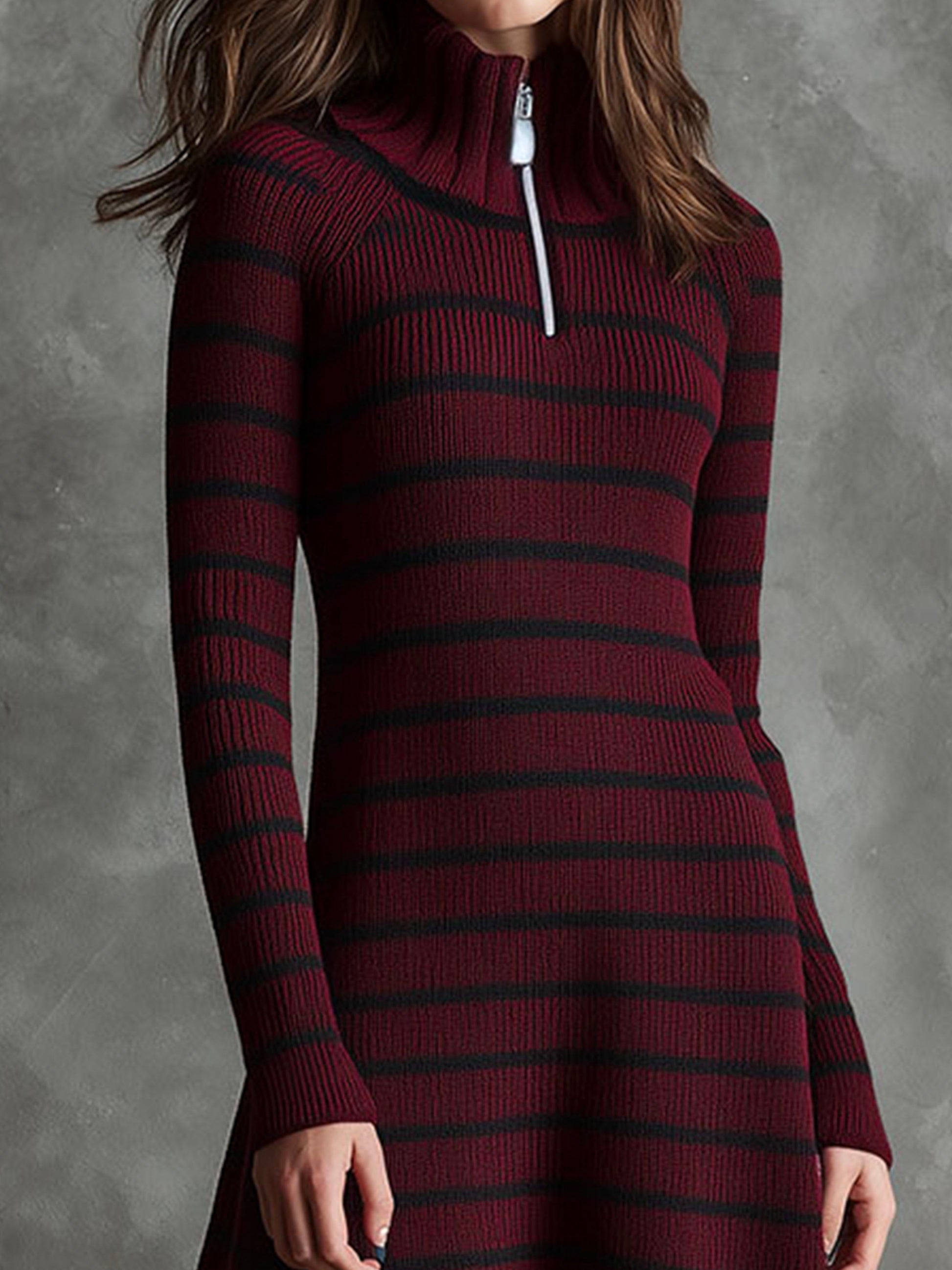 The Vintage Burgundy Turtleneck Striped Knit Half-Zip Sweater Dress is a must-have in your winter wardrobe. Its combination of comfort, style, and versatility makes it suitable for various occasions, whether you're attending a casual outing or a more formal event.