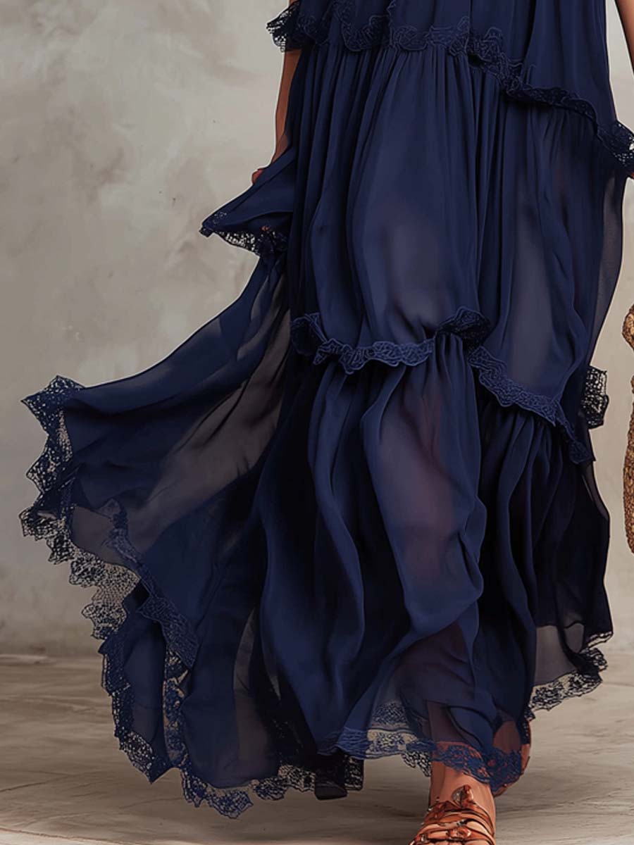 The Vintage Chiffon Maxi Dress with Lace Trim is a timeless piece that captures the essence of elegance and femininity. Made from soft chiffon fabric, this dress features intricate lace trims that add a touch of sophistication. With its flowing maxi length and vintage-inspired design, it's perfect for those who love classic style.
