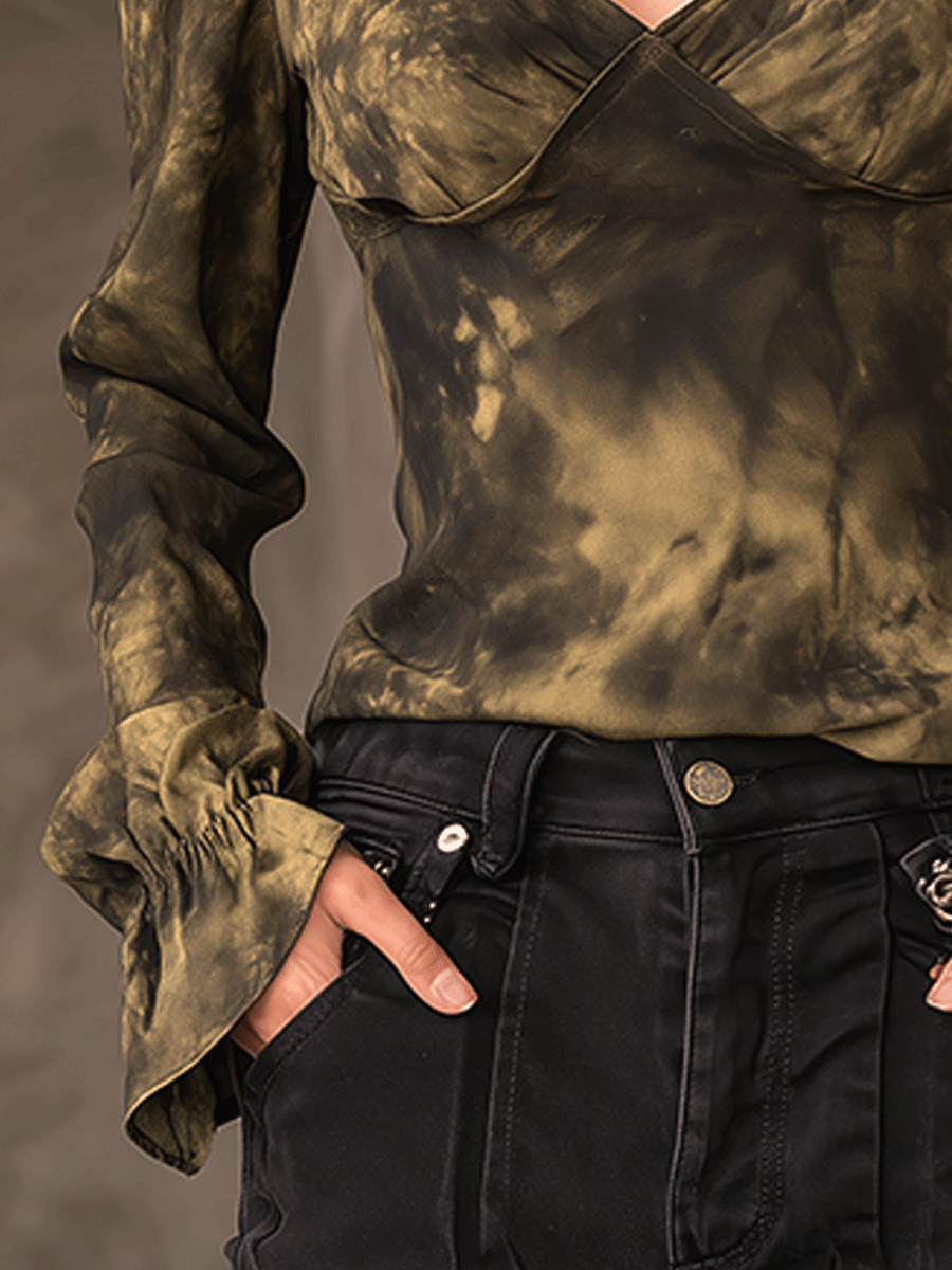 Vintage Dark Brown V-Neck Tie-Dye Trumpet Sleeve Top