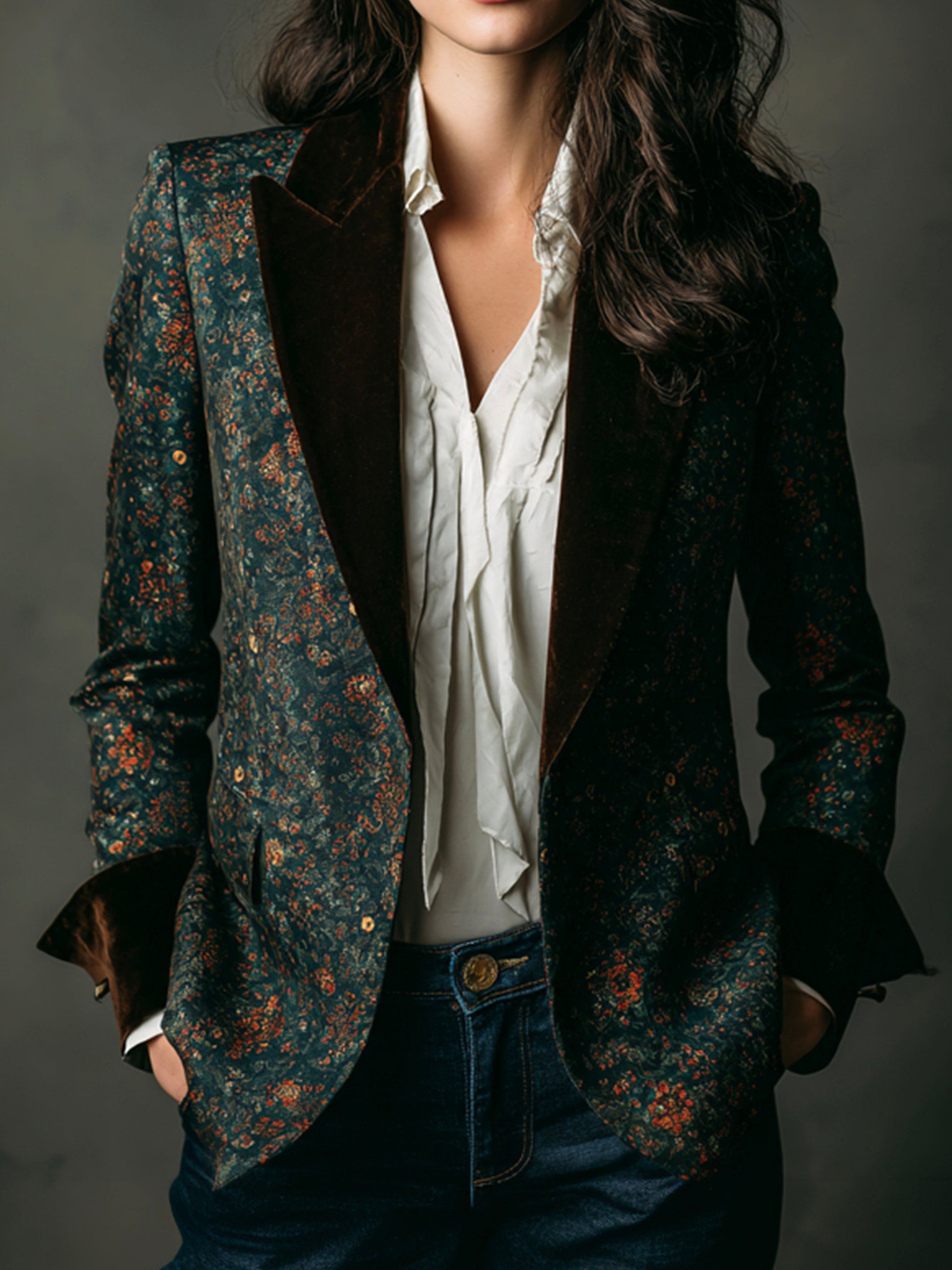 | Discover the timeless elegance of our Vintage Emerald Floral Print Blazer, exquisitely crafted with an eye-catching floral design and luxurious velvet lapels. This piece combines vintage charm with contemporary sophistication. | |