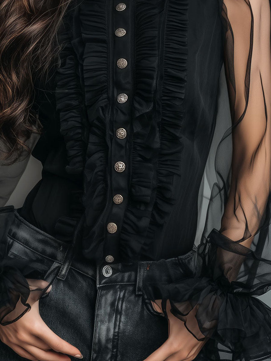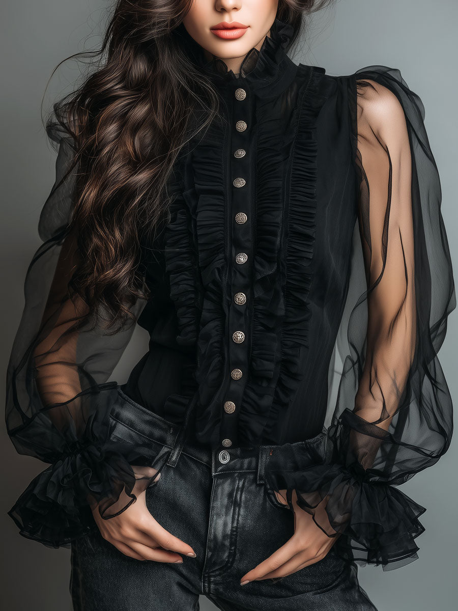 Vintage High Neck Black Sheer Organza Blouse With Ruffle Trim