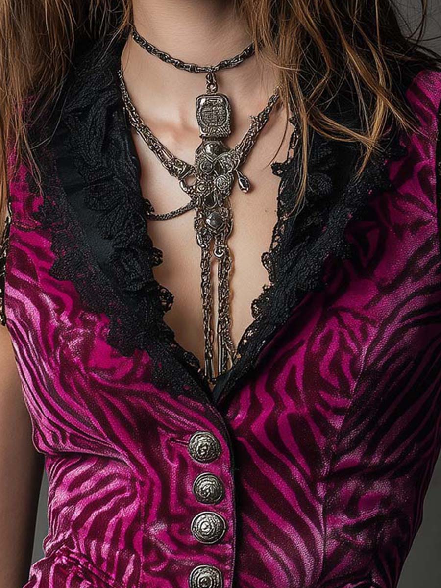 Incorporate a touch of vintage-inspired glamour into your wardrobe with this uniquely designed vest. Its combination of luxurious materials, striking prints, and intricate details make it a standout piece that can transition seamlessly from day to night. Whether dressing up or down, the Vintage Magenta Velvet Animal Print Lace Collar Metal Button Vest is an excellent addition to any fashion-forward individual's collection.