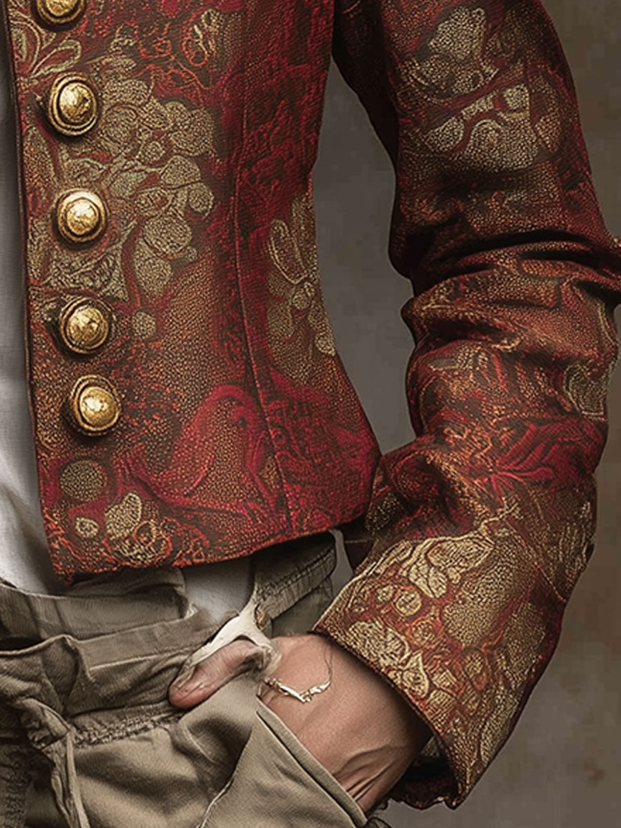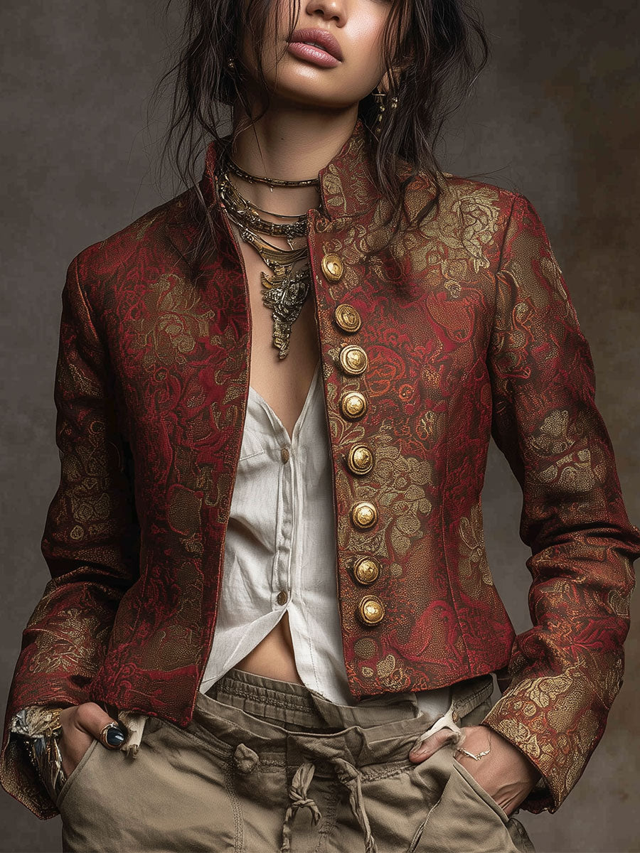 With its unique blend of vintage charm and modern sophistication, the Vintage Print Metal Button Short Blazer is an excellent addition to any fashion-conscious individual's wardrobe. Its versatile style and exquisite detailing ensure that it can be worn on a variety of occasions, making it a must-have piece for those looking to make a stylish statement.