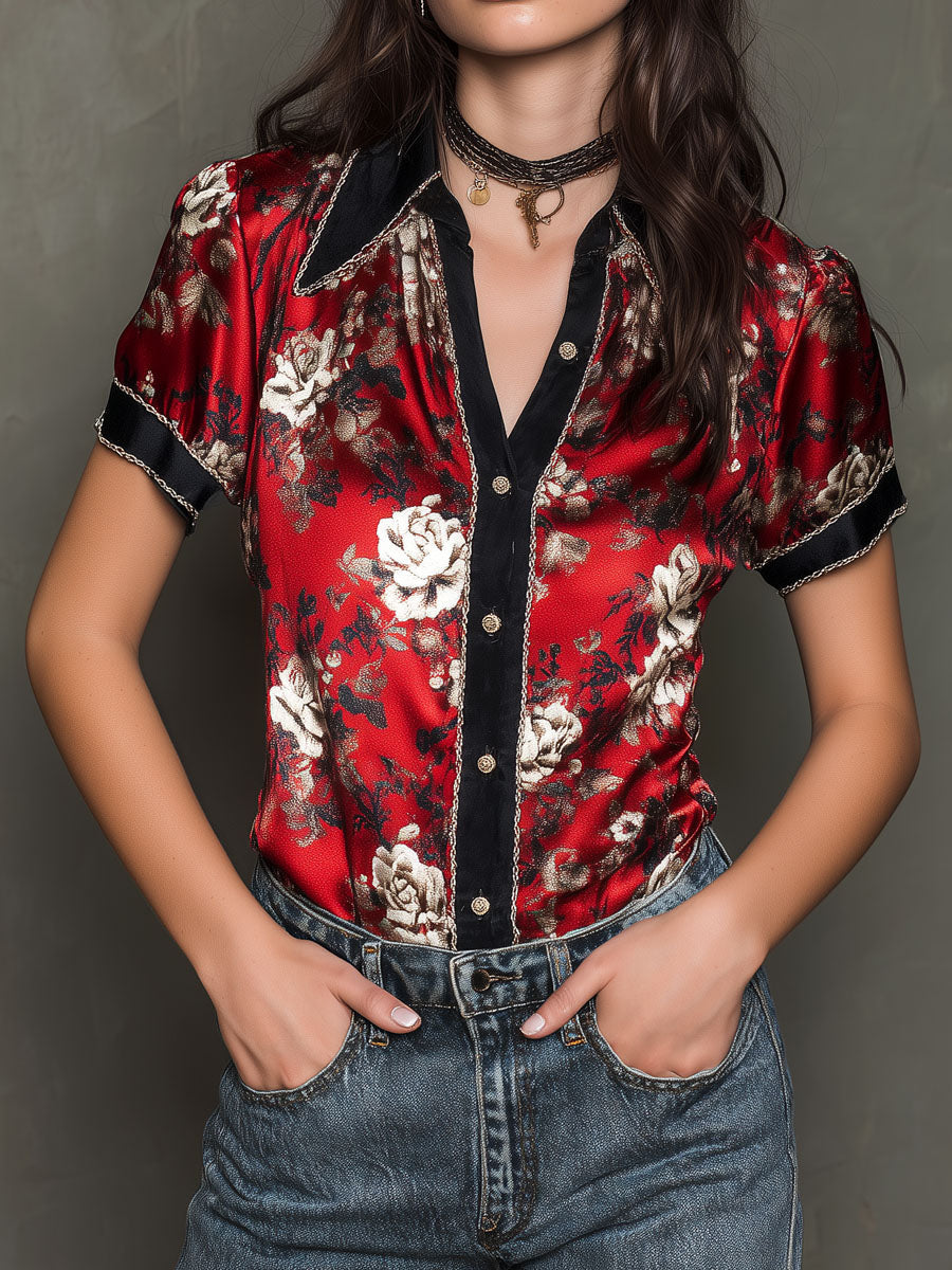 Vintage Red Floral Print Satin Blouse With Contrast Trim