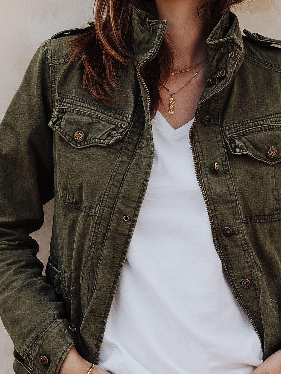 The Vintage Washed Cargo Pocket Jacket is an essential piece for those who appreciate style and utility in equal measure. Its thoughtful design and versatile appeal make it a must-have for any discerning wardrobe. Whether you're heading out for a day in the city or a casual gathering, this jacket promises to make you stand out effortlessly.