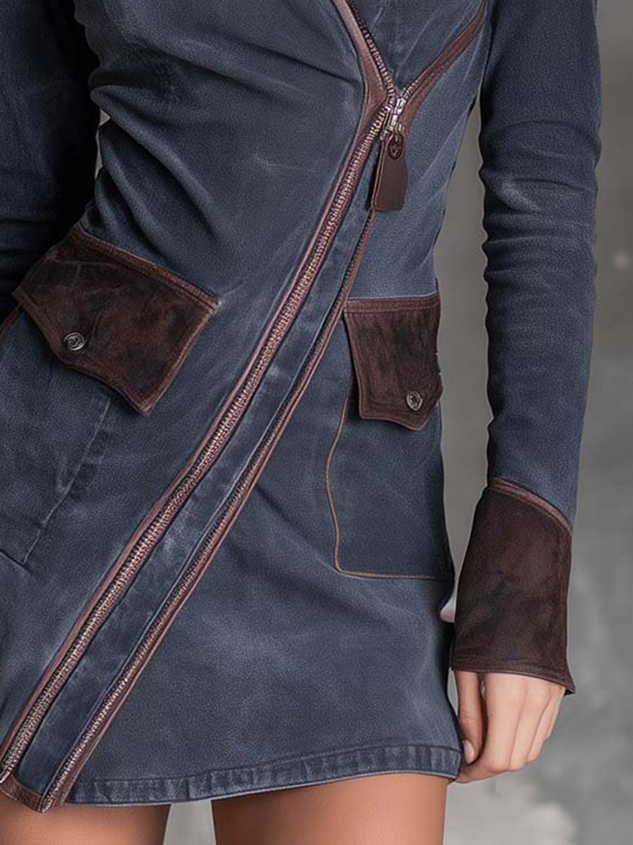 Where moto attitude meets feminine silhouette — this asymmetric zip dress jacket combines washed denim with eco-suede accents in deep espresso tones. The sharp cut and contrast textures bring industrial confidence and tailored elegance together. Designed with a body-hugging fit, angled zipper, and utility flap pockets, it transforms from outerwear to statement dress with effortless style.