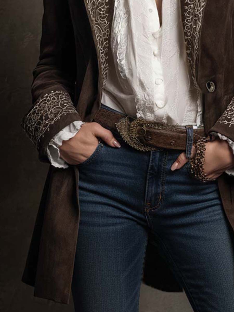 Pair with a white lace blouse and denim jeans for an effortless Western-boho mood.