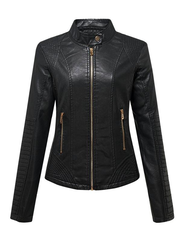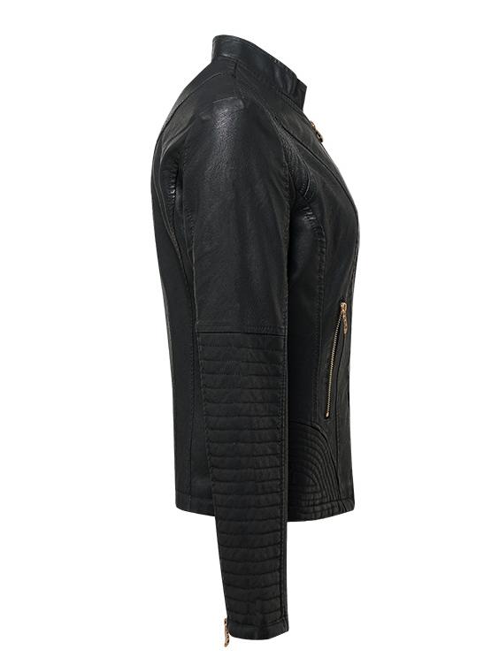 Women Sharp Stand Collar Slim Fit Leather Jacket