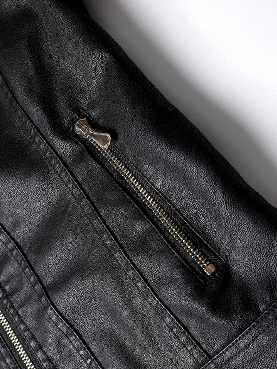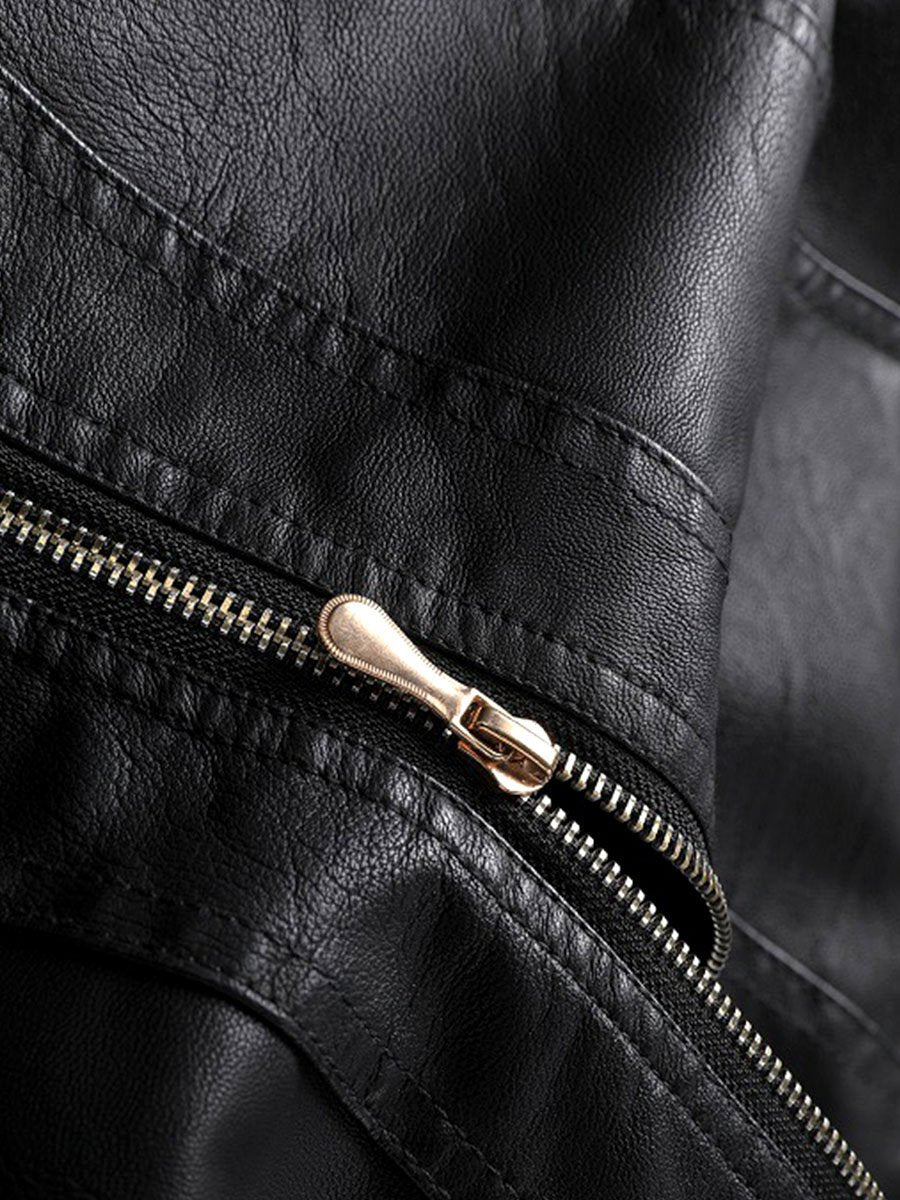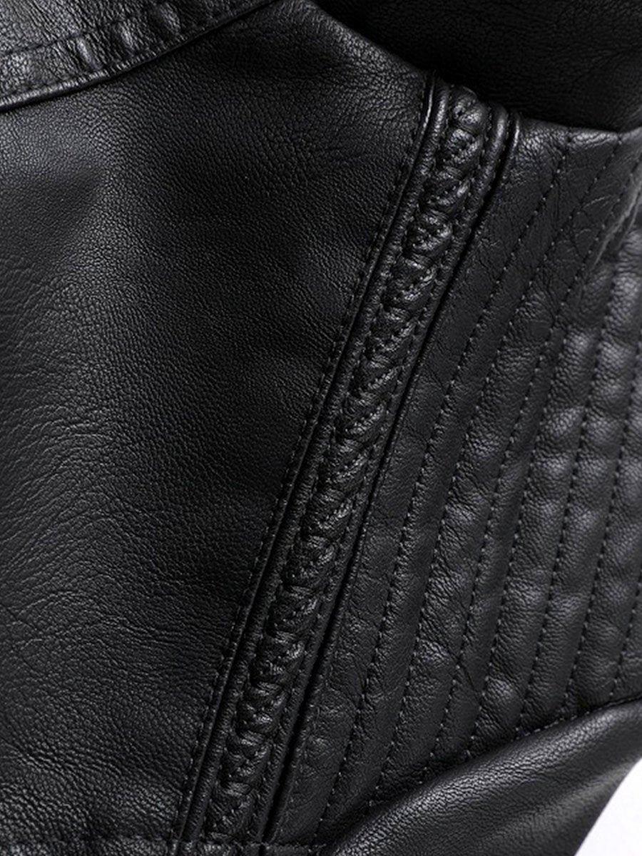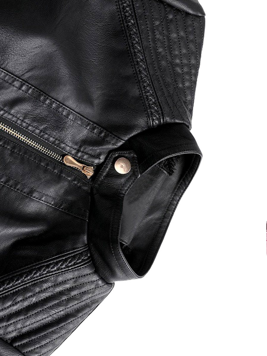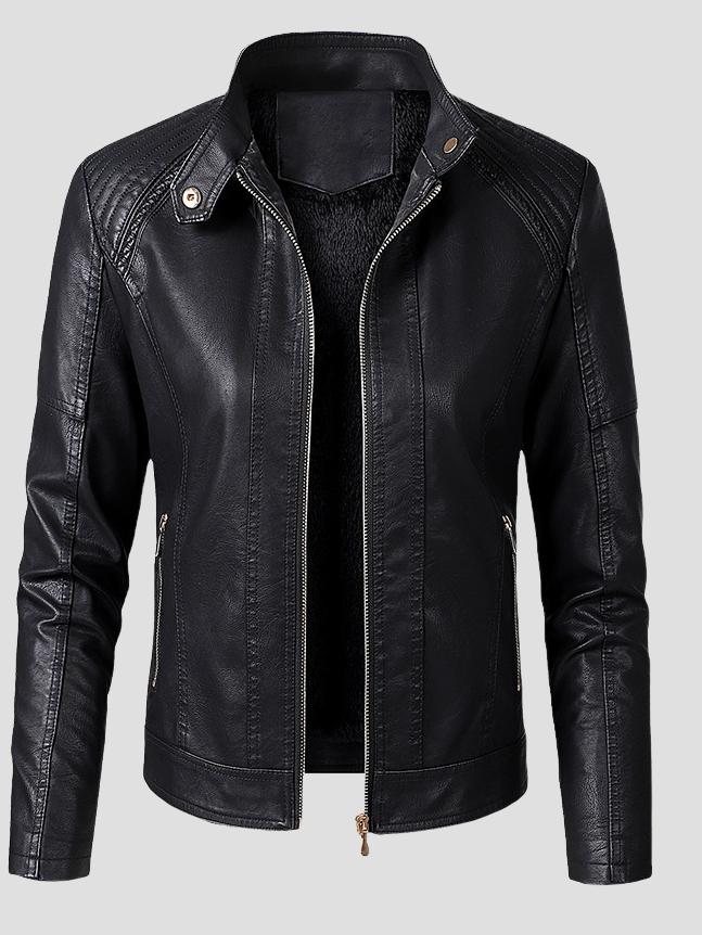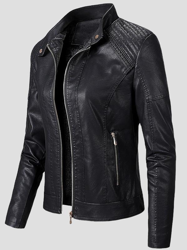 Women Warm Lined Stand Collar Leather Biker Jacket