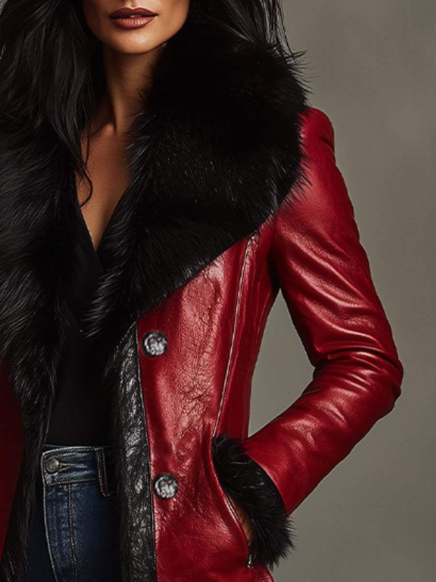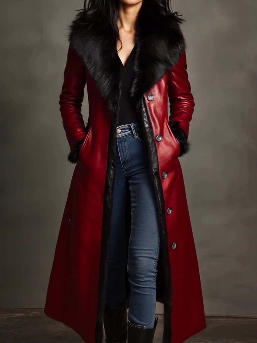 Women's Retro Fur Collar Contrasting Colors Leather Long Coat
