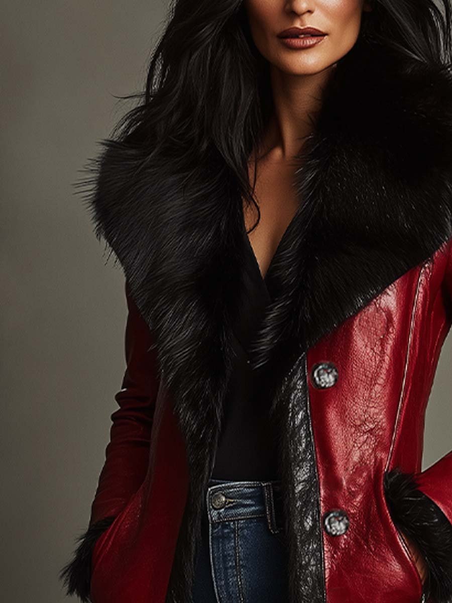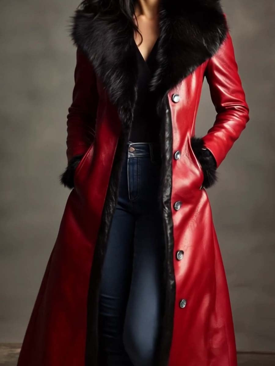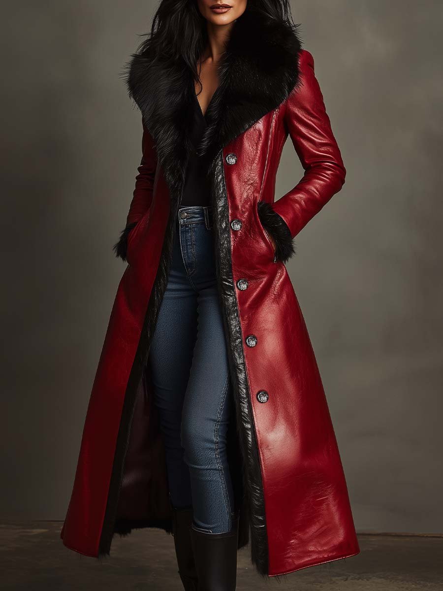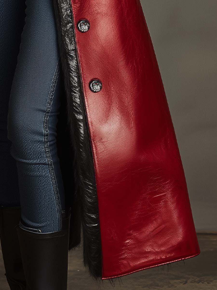 The leather coat is the epitome of vintage sophistication with a modern twist. Featuring a luxurious fur collar and bold contrasting colors, this long leather coat makes a stylish statement while keeping you warm. Crafted from premium leather, it offers durability and a refined finish, perfect for everyday wear or special occasions. The tailored fit flatters your figure, and the long silhouette adds elegance to any ensemble, making this versatile coat the ultimate blend of classic charm and contemporary style.