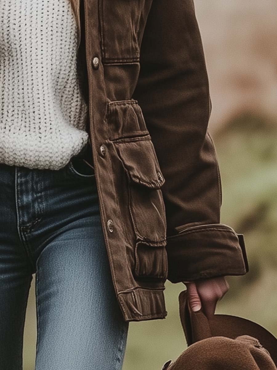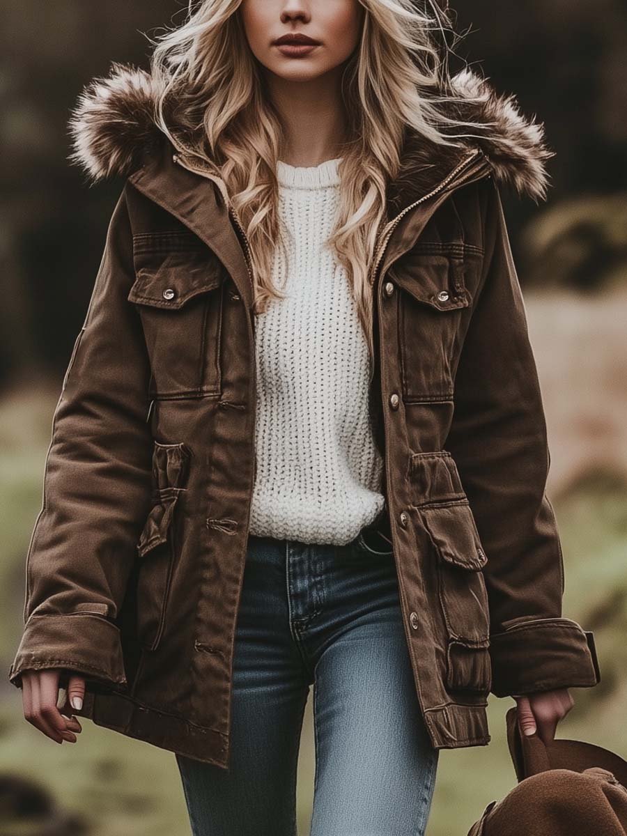 Women's Vintage Fur Hooded Work Windbreaker Jacket